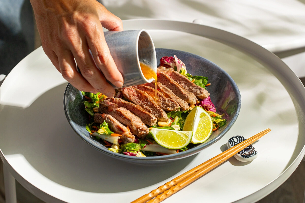 Этот рецепт — настоящая находка для тех, кто любит азиатскую кухню. Сочное мясо, хрустящий микс овощей и пикантная имбирная заправка создают идеальный баланс. Если приготовить заправку заранее, а вместо стейка взять куриную грудку су-вид, получится не менее вкусно, но ещё быстрее. Такой салат хорош и тёплым, и охлаждённым — идеально для летних обедов или лёгких ужинов.