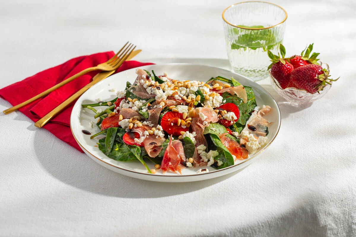 - Шпинат, клубнику и вяленые помидоры соедините с заправкой.