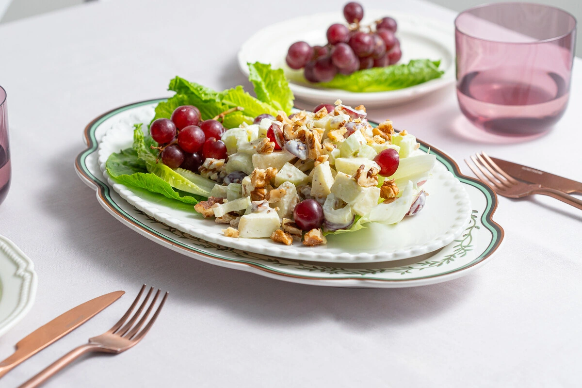 Этот легендарный салат был придуман в нью-йоркской гостинице «Вальдорф-Астория» аж в 1896 году, но популярен во всём мире и сегодня. Мы немного изменили классический рецепт и использовали вместо майонеза греческий йогурт с горчицей. Получилось по-летнему легко и свежо.