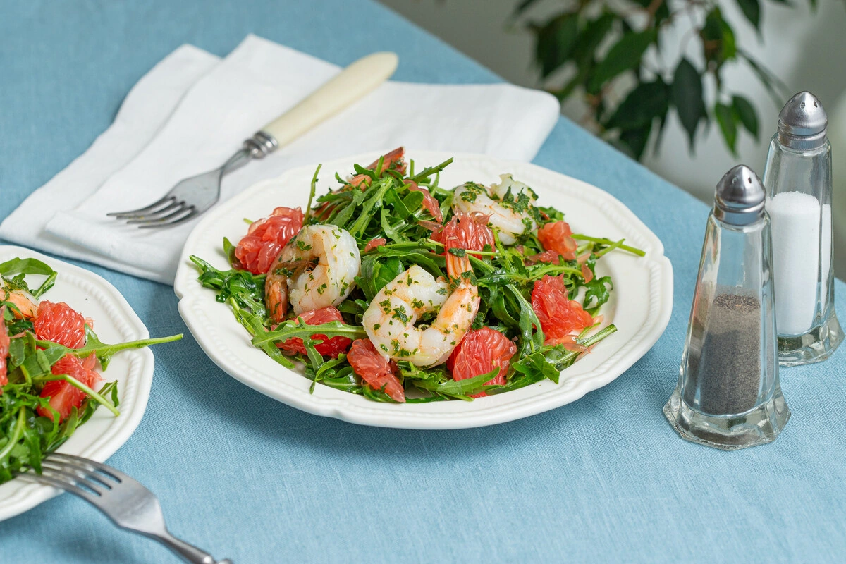 - Креветки смешайте с оставшимся мятным соусом и выложите на листья салата. Украсьте сверху ломтиками грейпфрута и полейте оставшимся оливковым маслом.