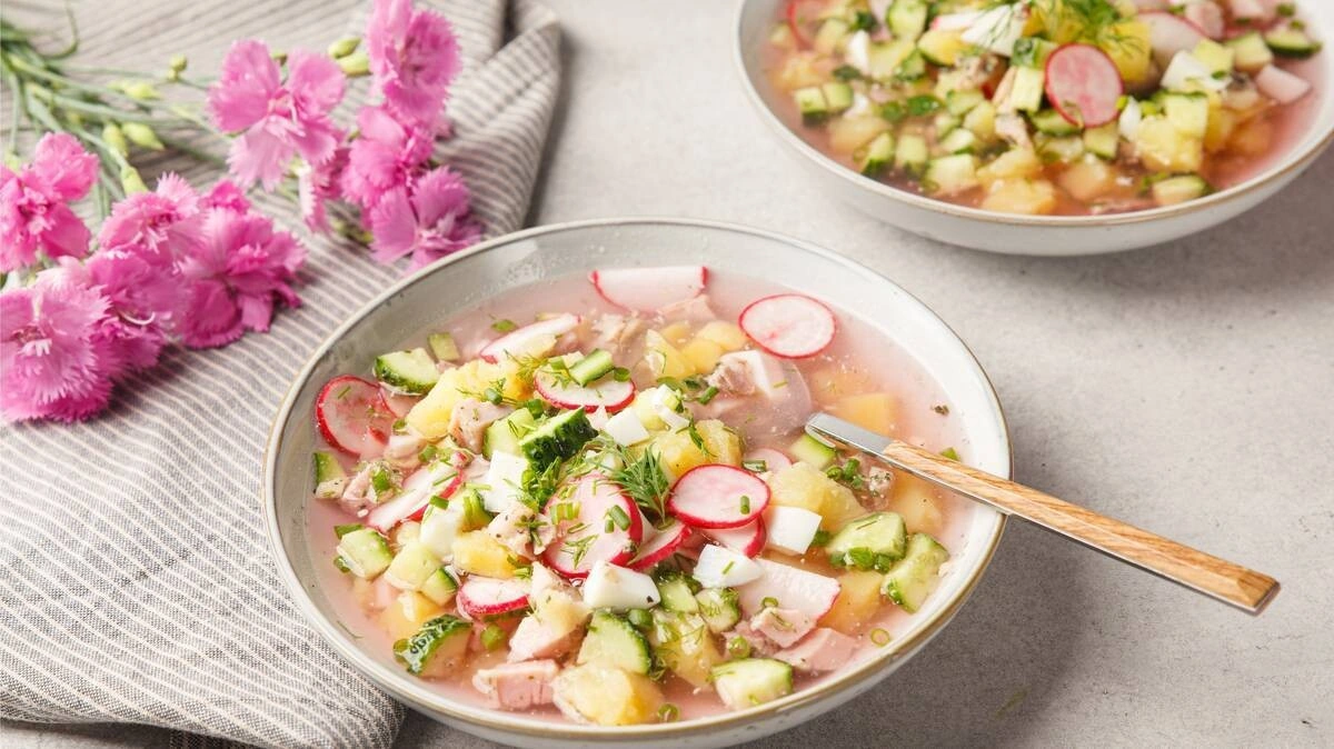 Традиционная окрошка делается на белом квасе, в быту – на темном, а вы попробуйте на розовом. Яркий вкус окрошке даст цыпленок су-вид.