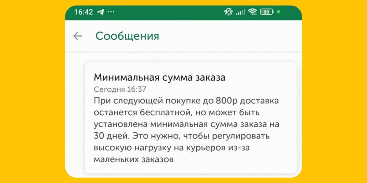 При доставке по городу: если за последние 60 дней доля заказов до 800 рублей (суммы персонального порога) составляет 30% и более, на 30 дней может быть установлена минимальная сумма заказа — доставка останется бесплатной, но будет действовать минимальный порог 800 рублей на стоимость заказа.