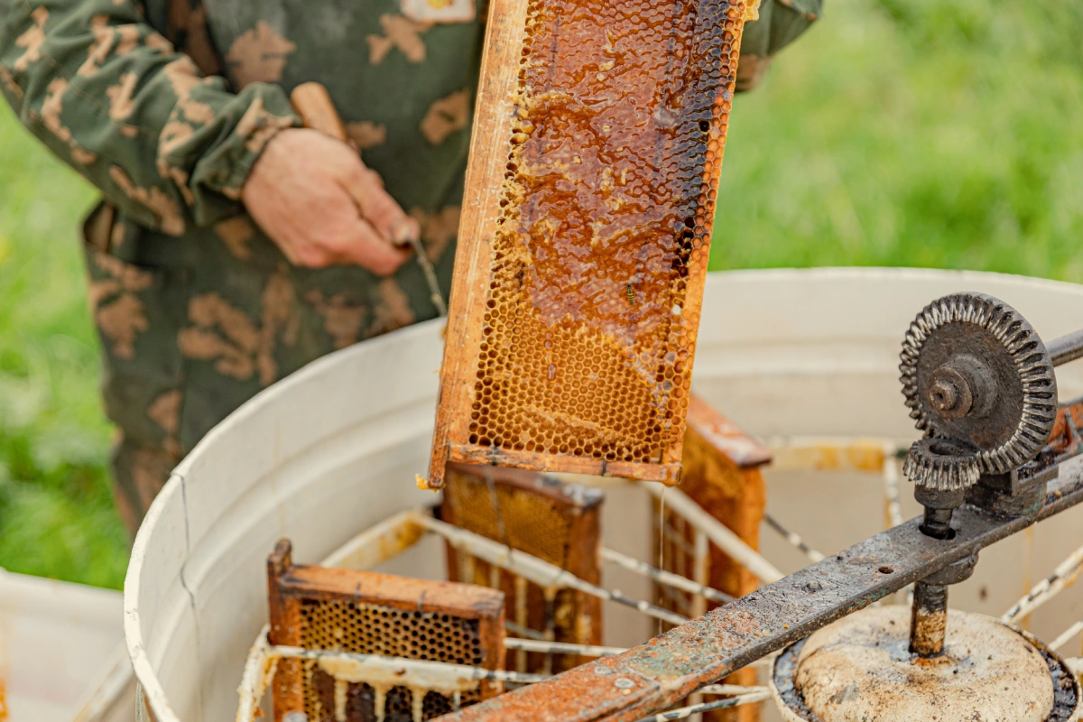 Рамки с мёдом погружают в медогонку и раскручивают её. Под действием центробежной силы мёд из сотов вытекает на стенки, а затем на дно медогонки. Собранный мёд перевозят на производство, где продукт будет очищен фильтром в 20 микрон, а также будут проведены все лабораторные исследования.