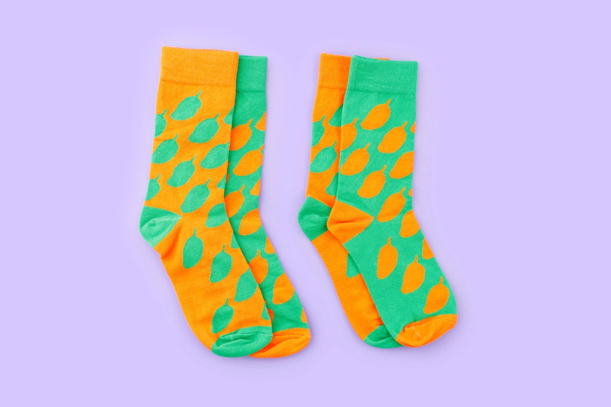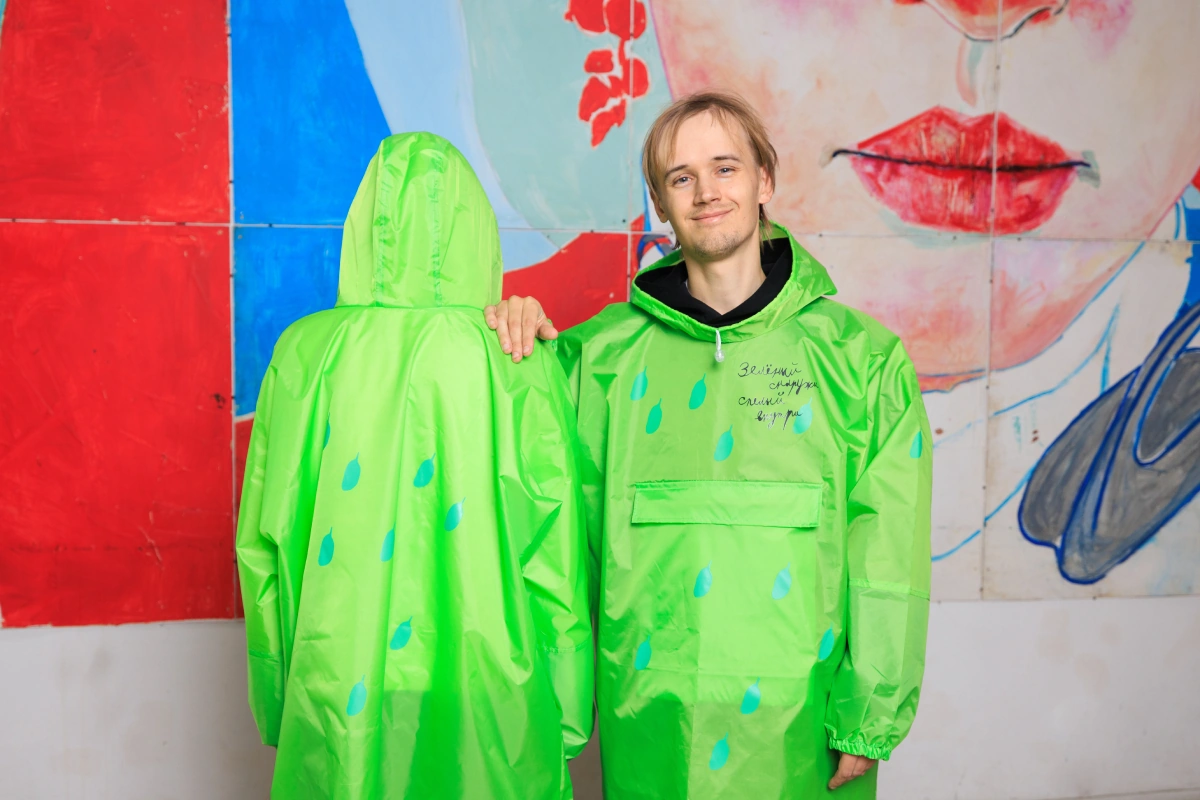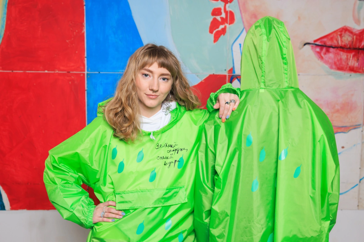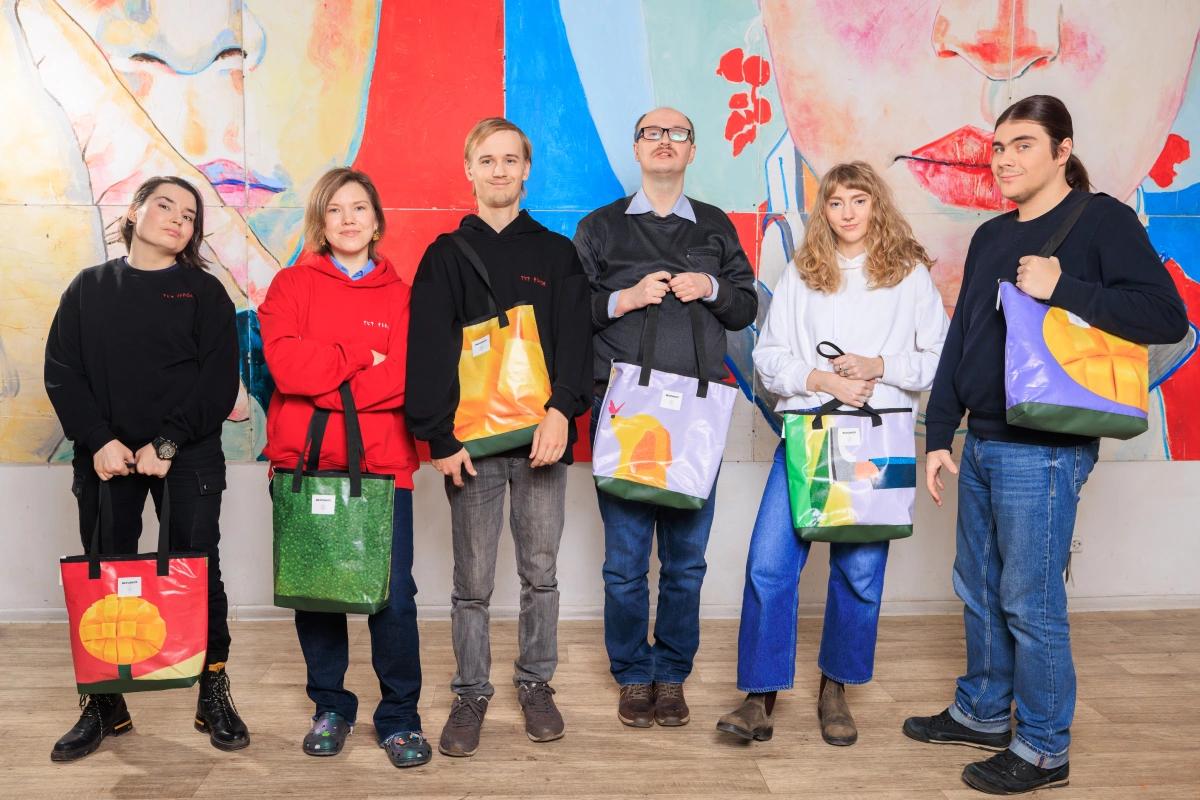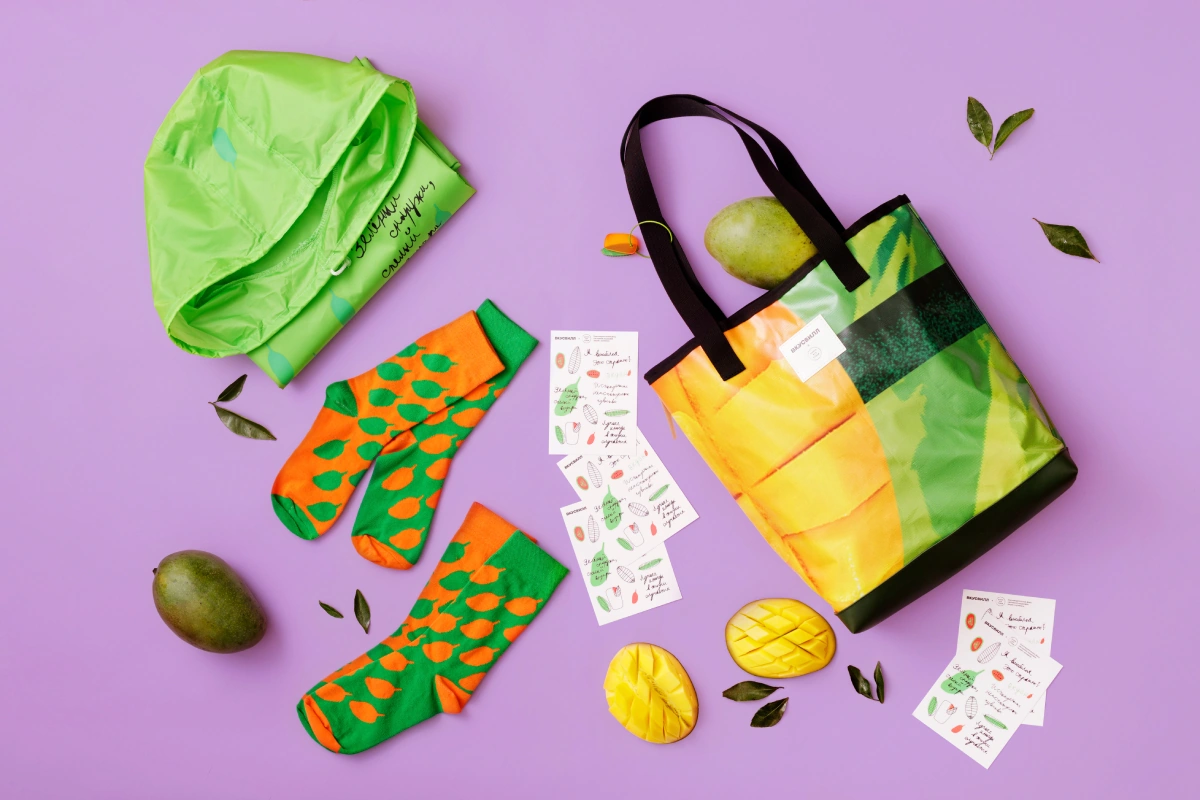 В нашем наборе — дождевик, чтобы спасаться от снегодождей; яркие тёплые носки двух размеров, чтобы раскрасить серость будней; неповторимые шоперы, сделанные из рекламных баннеров, — одна сумка не похожа на другую; а ещё милые брелки в виде манго с листочком и стикерпак с цитатами студентов фонда: именно их изображение манго стало и главным паттерном коллекции мерча.