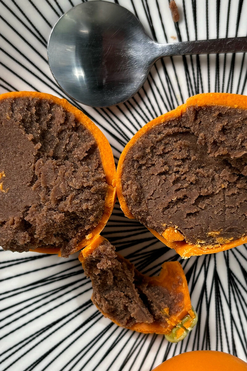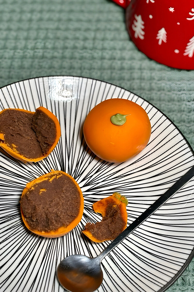 Хочу отметить, что, несомненно, в плюс сыграл тот факт, что внутри моя любимая картошка, не настоящая, конечно, хотя от неё я тоже без ума, а пирожное. Да и оформление в виде новогоднего фрукта вызывает соответствующее настроение, мой маленький дегустатор немедленно захотела съесть такой необычный десерт.