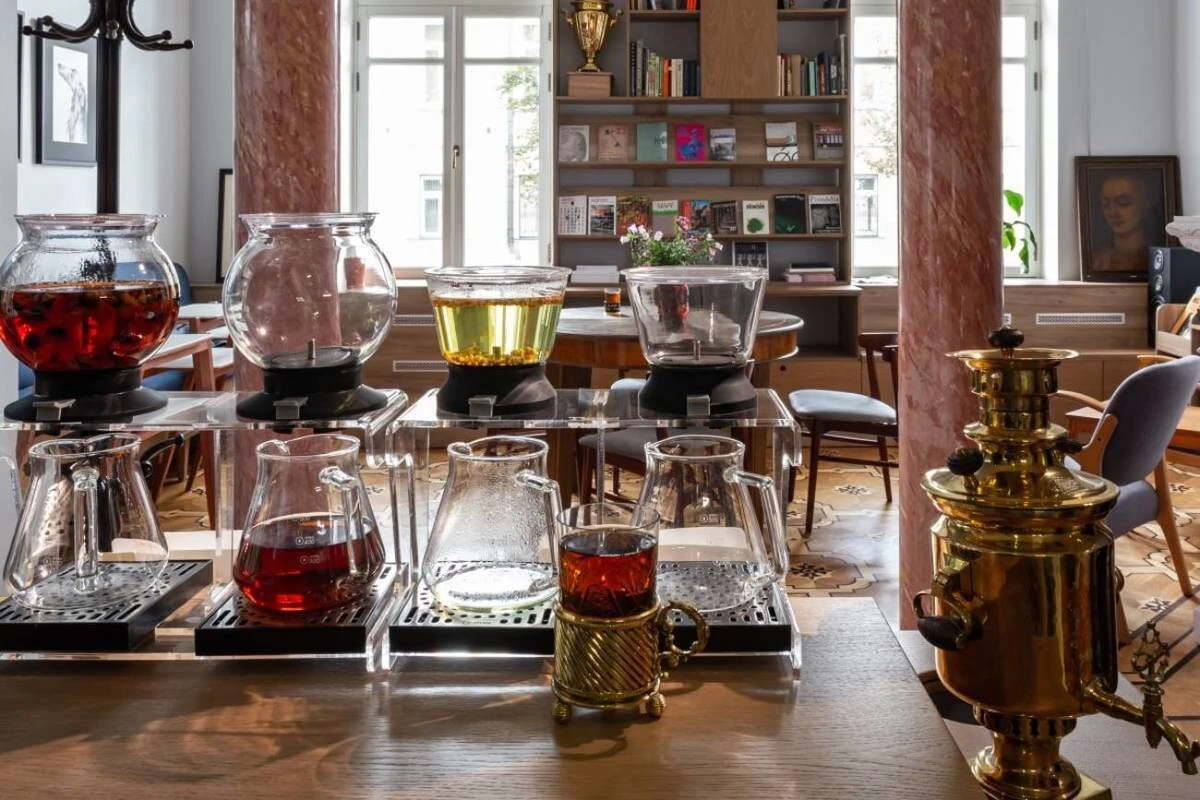 На столе чайной — tea dripper, особый вид заварочного чайника. А на полках — самовар и подстаканники. Те самые, что в поездах спасают чай от проливания (хотя изначально защищали руки от горячих стаканов). Но не будем забегать вперёд. Ещё обсудим условия правильной заварки, моду на чай и агитационный фарфор Малевича. Да, было в истории чая и такое.