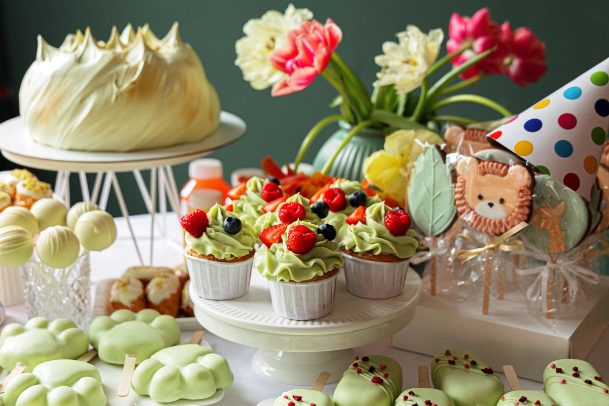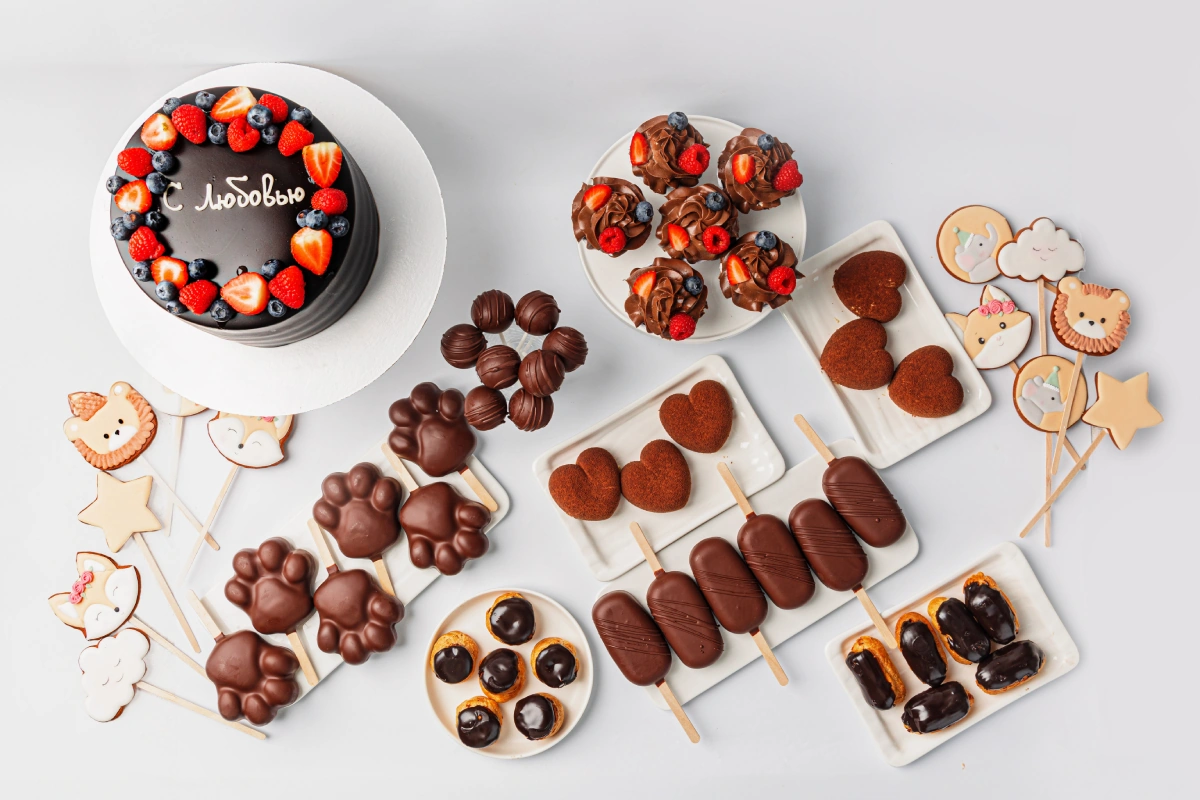 И, конечно же, самые разные сладости — пряники, конфеты, пирожные, торты. Их, кстати, можно приготовить с вашим индивидуальным дизайном и поздравлением или заказать кэнди-бар.
