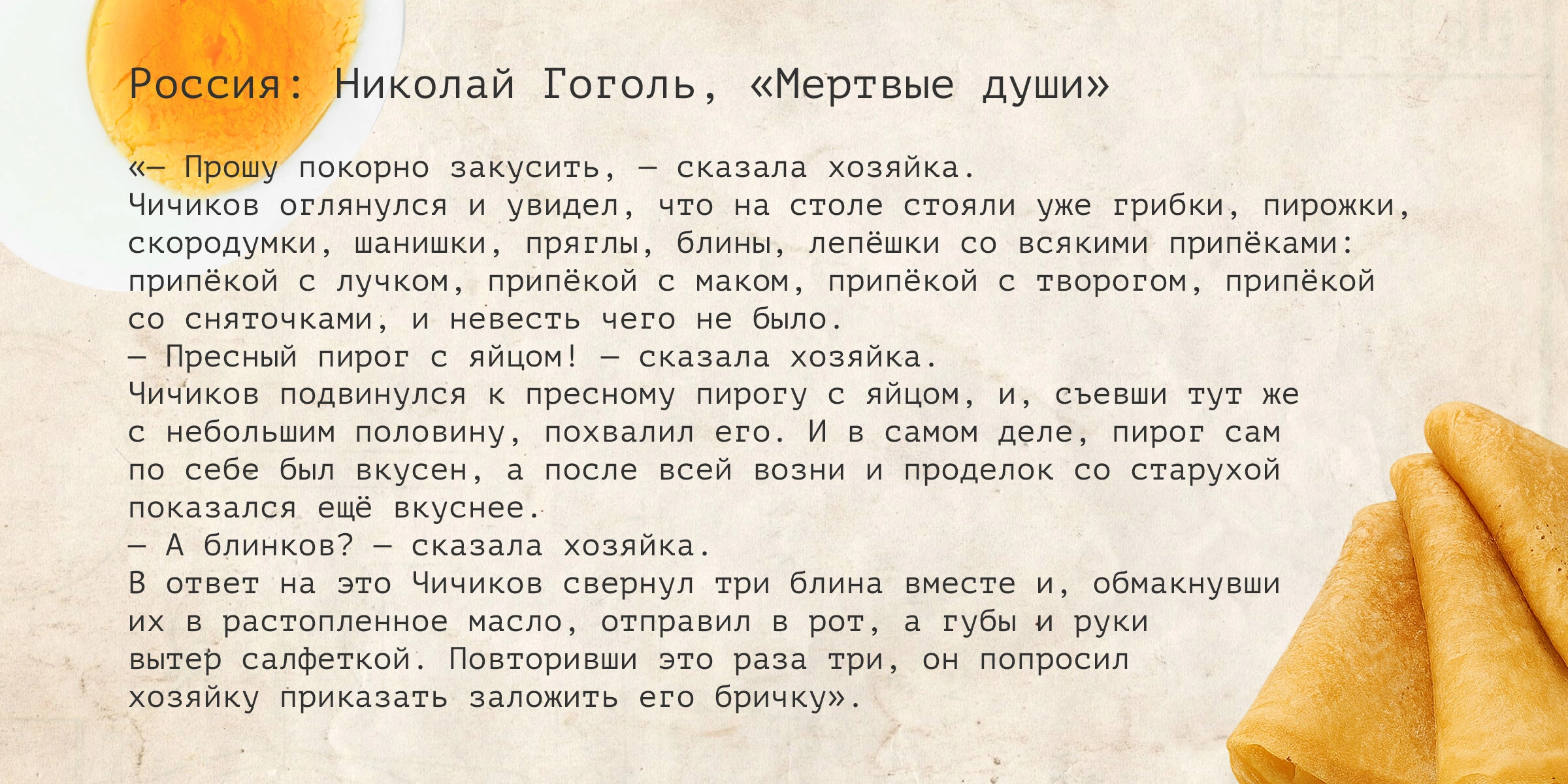Николай Васильевич очень внимательно относился к тому, что едят его герои, — кулинарные пристрастия могут рассказать о человеке больше, чем пространные описания характера и поступков. Причём столовые сцены Гоголь писал со знанием дела — неудивительно, ведь он сам не только ценил хороший обед, но и при случае мог бы его приготовить: «Я знаю кой-какие ремёсла. Хороший портной, недурно раскрашиваю стены алфрескою живописью, работаю на кухне и много кой-чего уже разумею из поваренного искусства…». От современников осталось немало свидетельств о нежной любви Гоголя к итальянской кухне, особенно к макаронам с сыром и равиоли. Сравниться с ними в сердце (а точнее, в желудке) писателя могли только матушкины полтавские вареники.