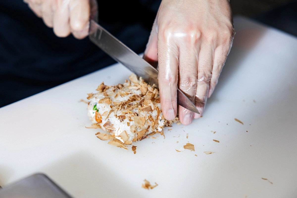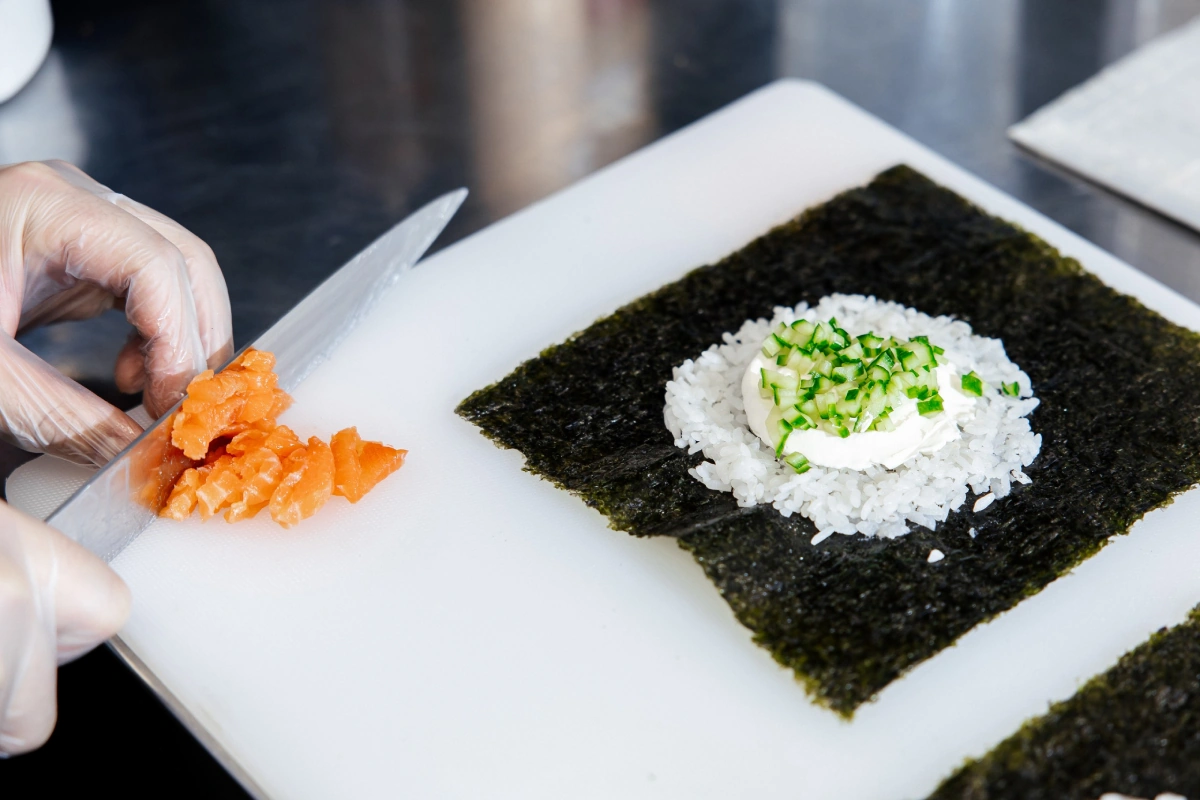 — Перед тем как резать ролл, нужно обмакнуть кончик лезвия в воду. Далее нож ставится вертикально рукояткой вниз, чтобы вода стекла по лезвию и равномерно распределилась. Так нарезка роллов становится легче.