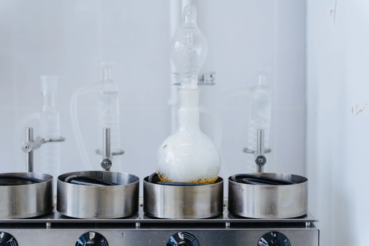 После цехов мы пошли в лабораторию. Она выглядит, как в научно-фантастическом фильме: колбы, пробирки, розовые бурлящие жидкости — всё это нужно, чтобы проверять продукт на всех этапах.