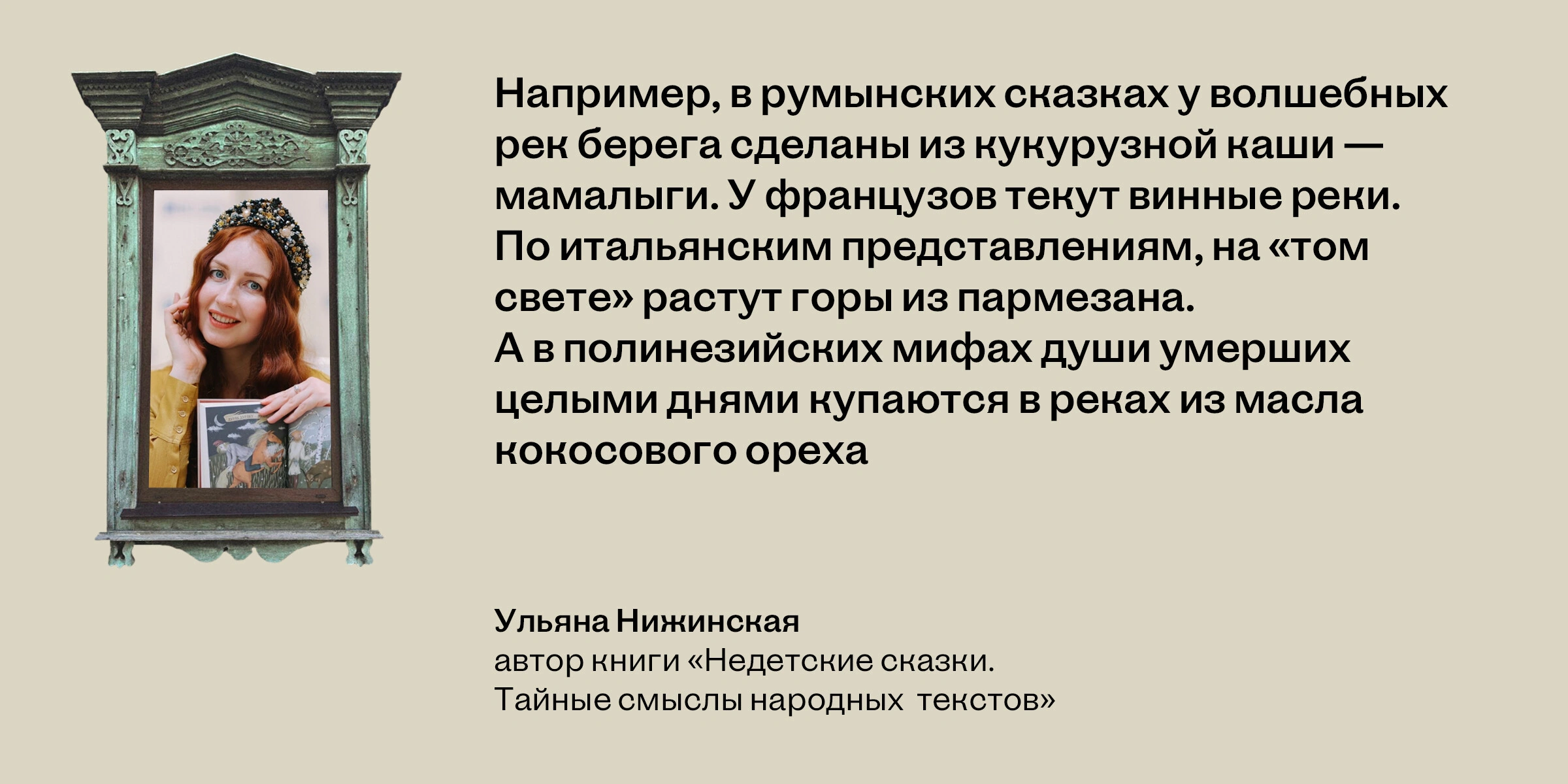 Как еда была связана со всеми этапами и сферами жизни человека, что и зачем предстаёт в волшебных историях, она рассказывает в книге «Недетские сказки. Тайные смыслы народных текстов»: