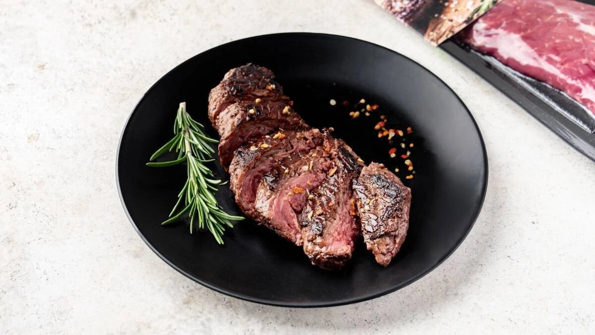 - Стриплойн и другие стейки с жировыми прослойками готовят в среднем по 3 минуты с каждой стороны, так как жир нагревается быстрее и сам начинает «готовить» мясо, которое окружает. На фото ниже — стейк стриплойн из ВкусВилла.