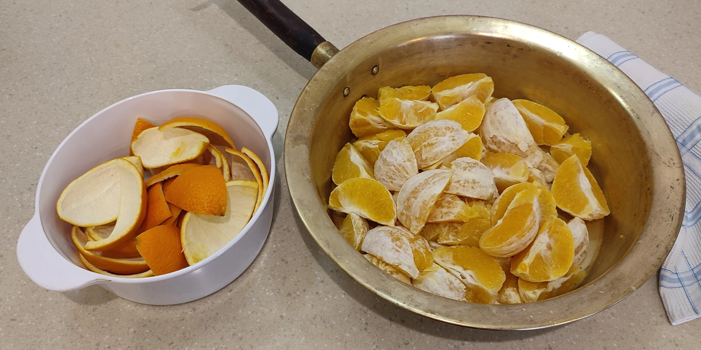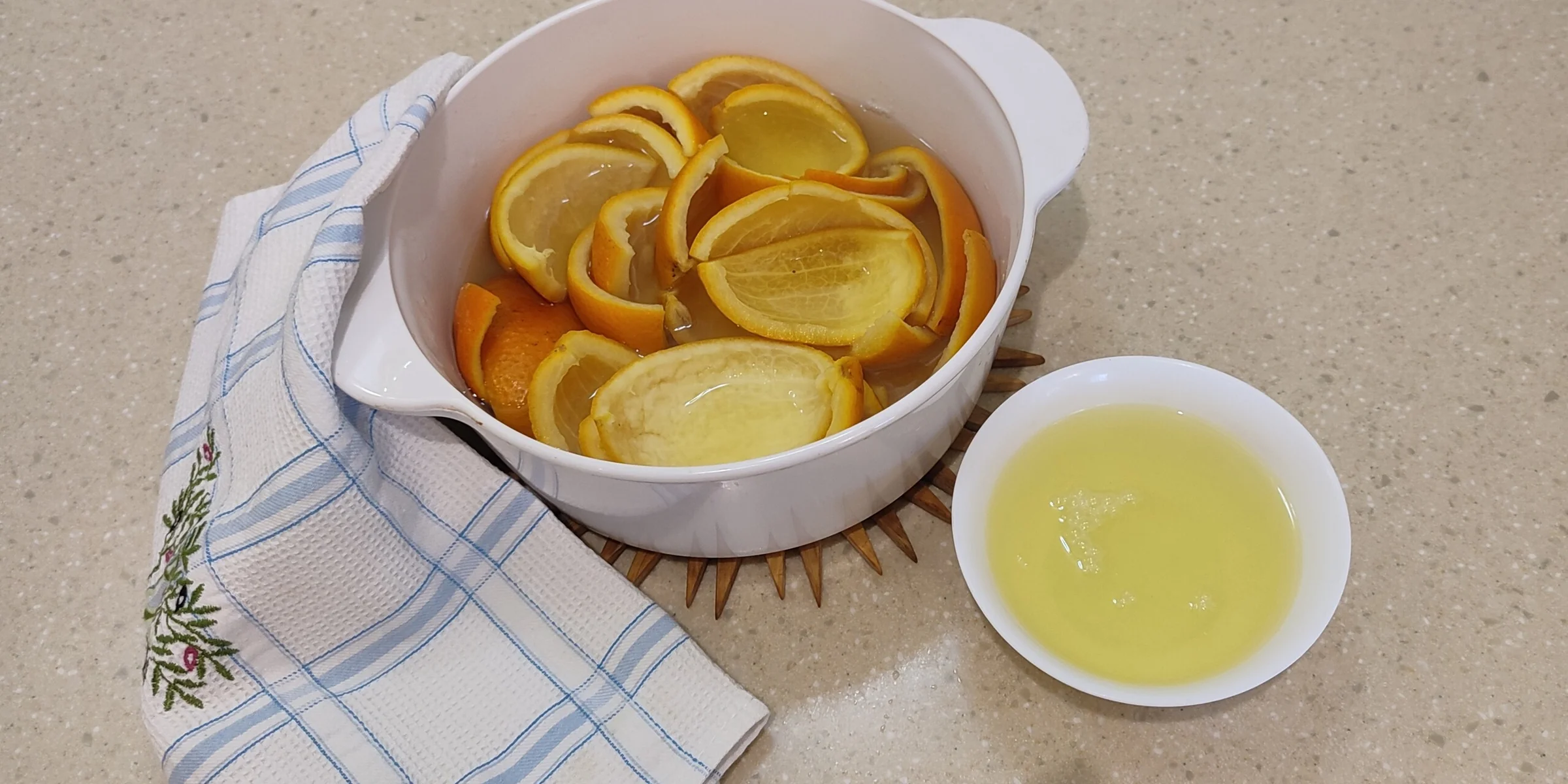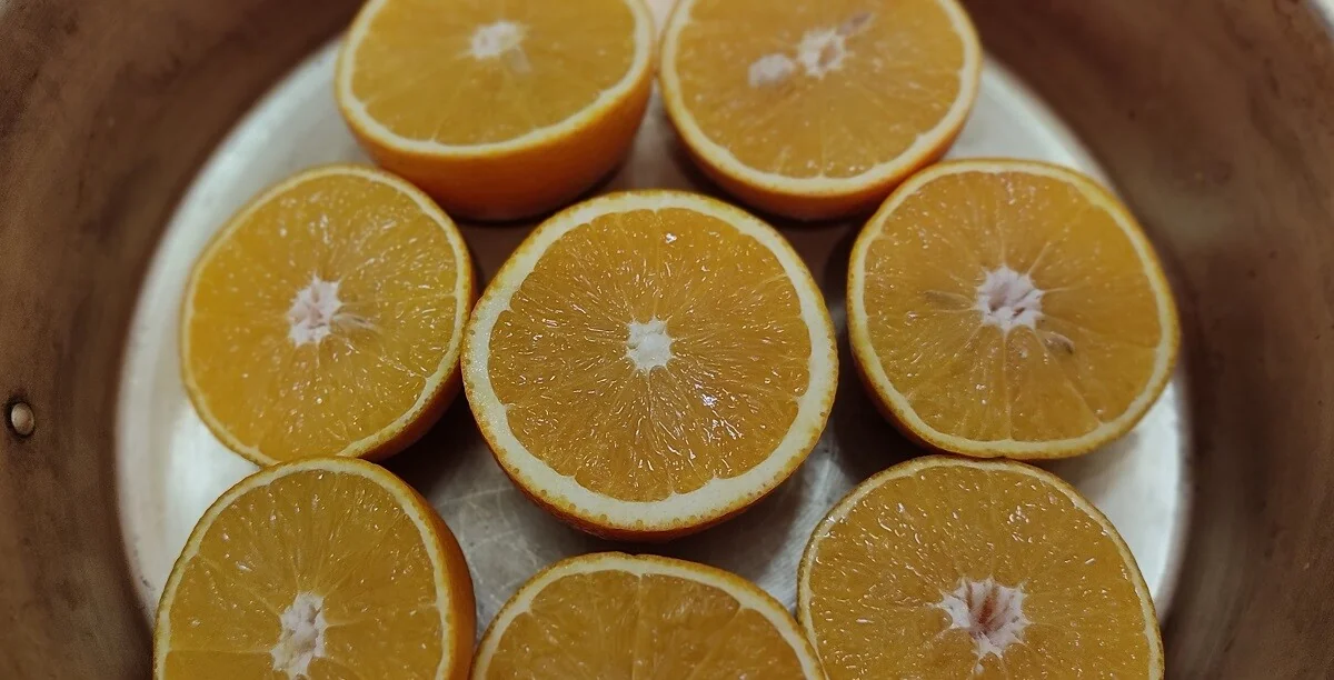 - Сняла с апельсинов корки, залила их водой, довела до кипения и проварила минут 5, чтобы ушла горечь. Чем меньше варить, тем пикантнее будут цукаты.