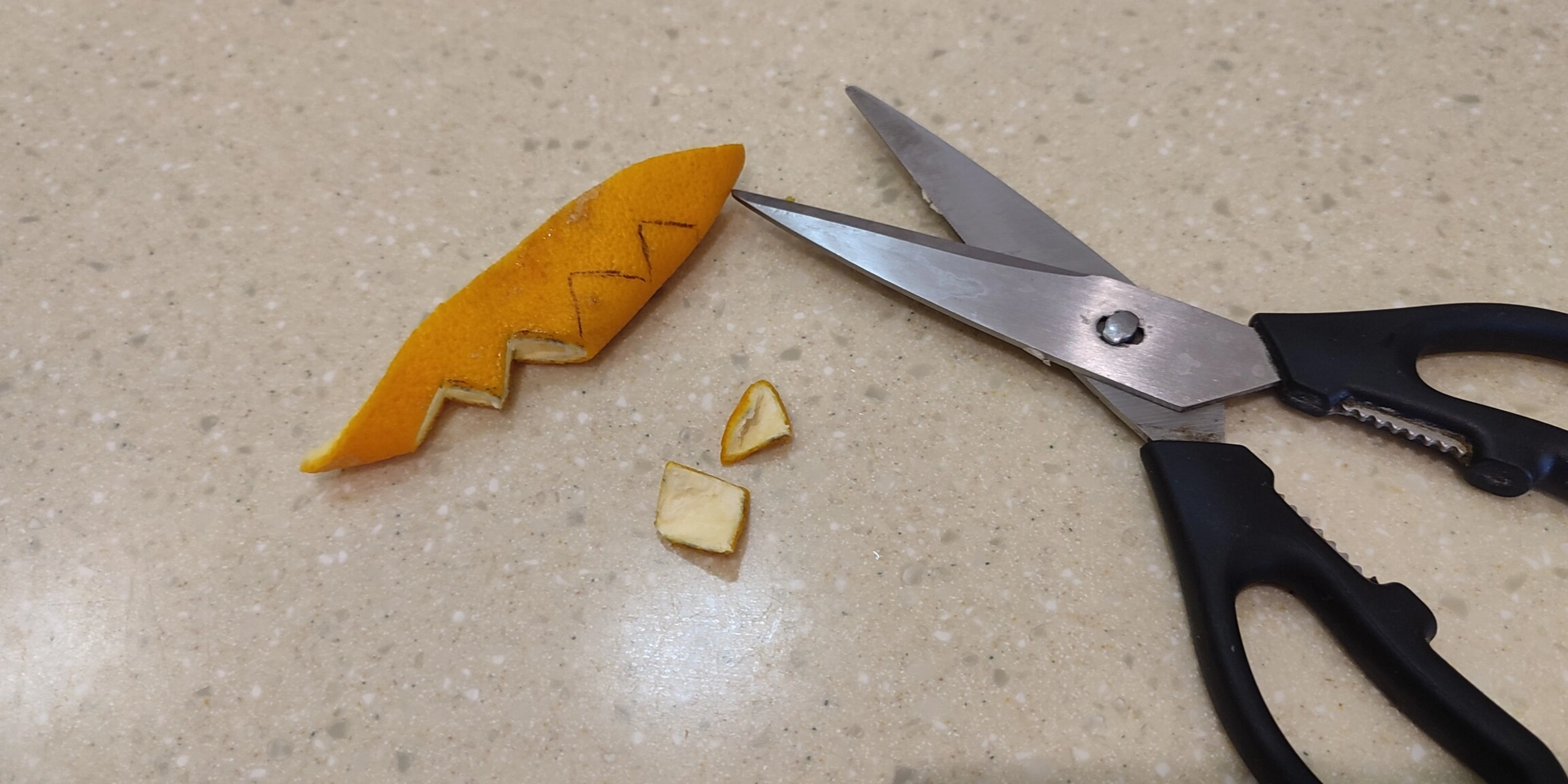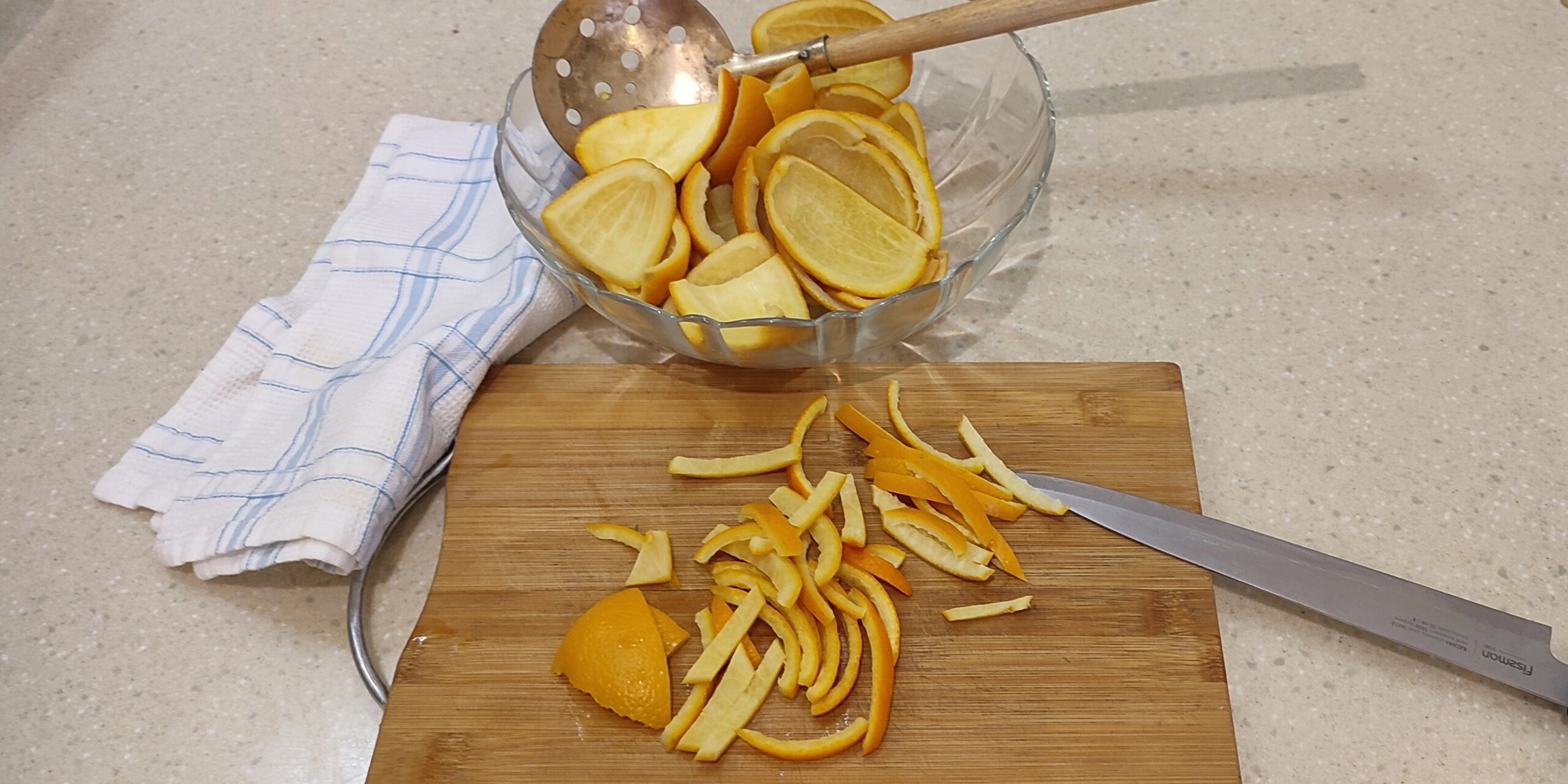 - Воду слила, оставив около 30 мл для сиропа, а корки нарезала на полоски +/– 5 мм. Резать можно как нравится, лишь бы кусочки были одинакового размера и не слишком крупные — так они быстрее и равномернее пропитаются сиропом, да и есть потом приятнее.
