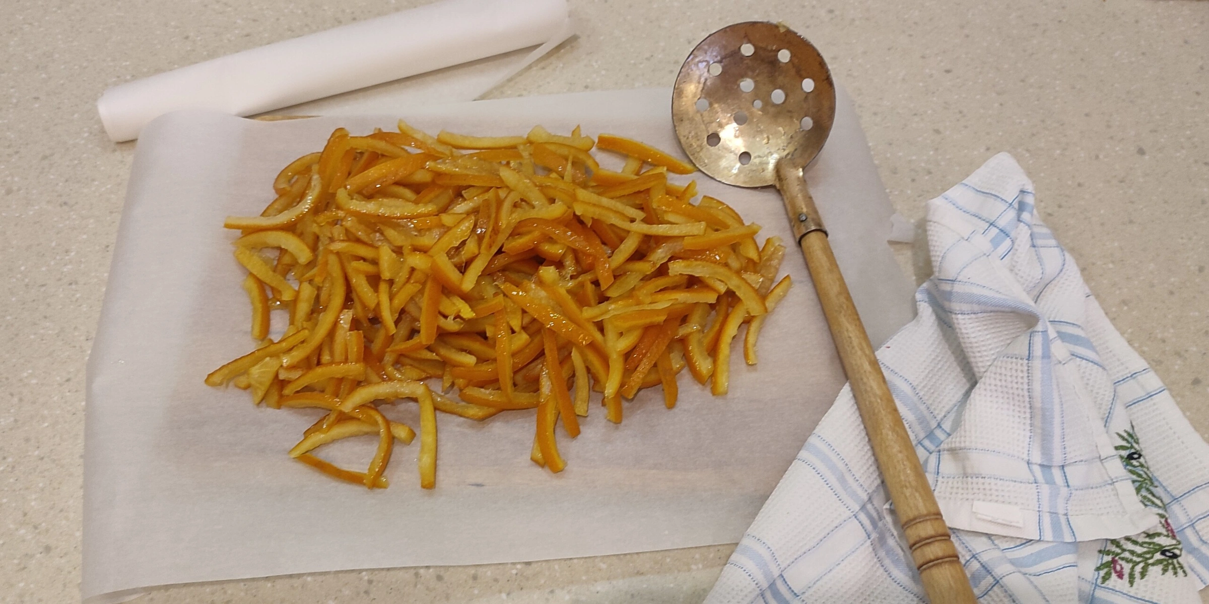 - На следующее утро доварила цукаты — около 10 минут, чтобы корочки стали почти прозрачными. Выложила в один слой на пергамент, оставила их подсушиваться и дразнить домочадцев мощным апельсиновым духом. Всё!
