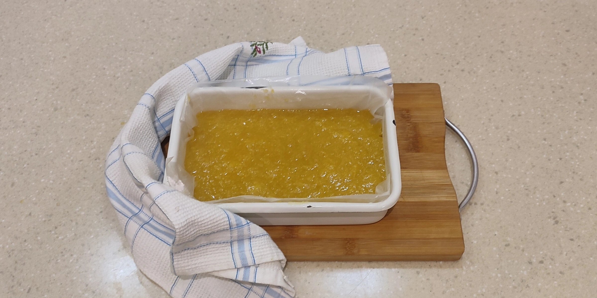 2. Измерила количество пюре, добавила агар по инструкции на пакете и проварила в течение 2–3 минут. Вылила в застеленный пищевой плёнкой лоток и убрала в холод. Через пару часов мой мармелад был готов.
