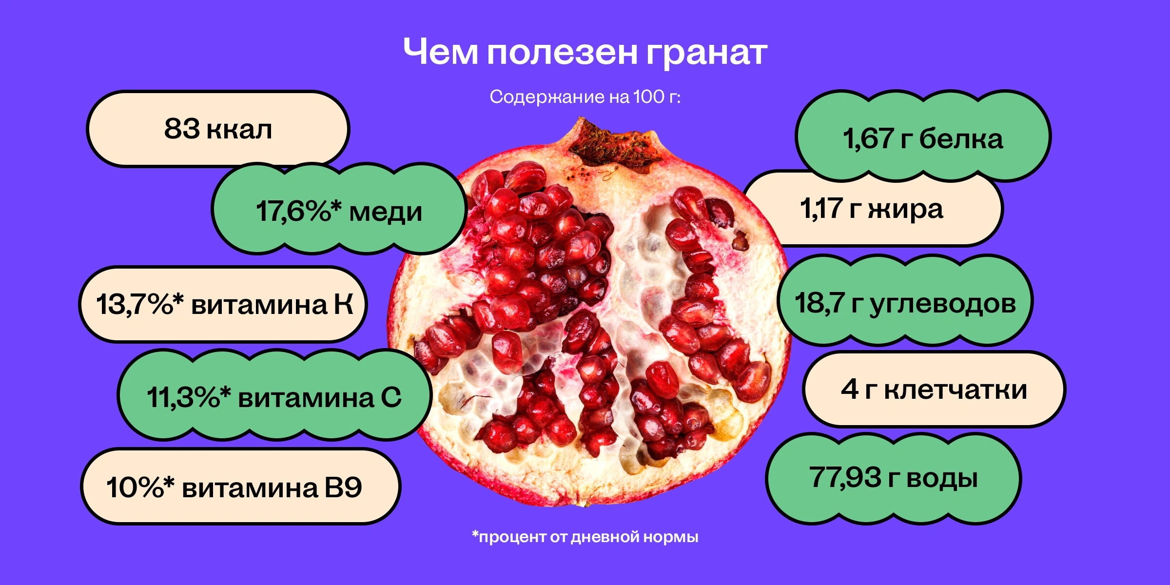 В 100 г свежего граната содержится около 0,3 мг железа. Это небольшое количество по сравнению с рекомендованной суточной нормой (8 мг для мужчин и 18 мг для женщин 19–50 лет). К тому же минерал из растительных источников пищи усваивается хуже, чем из продуктов животного происхождения.