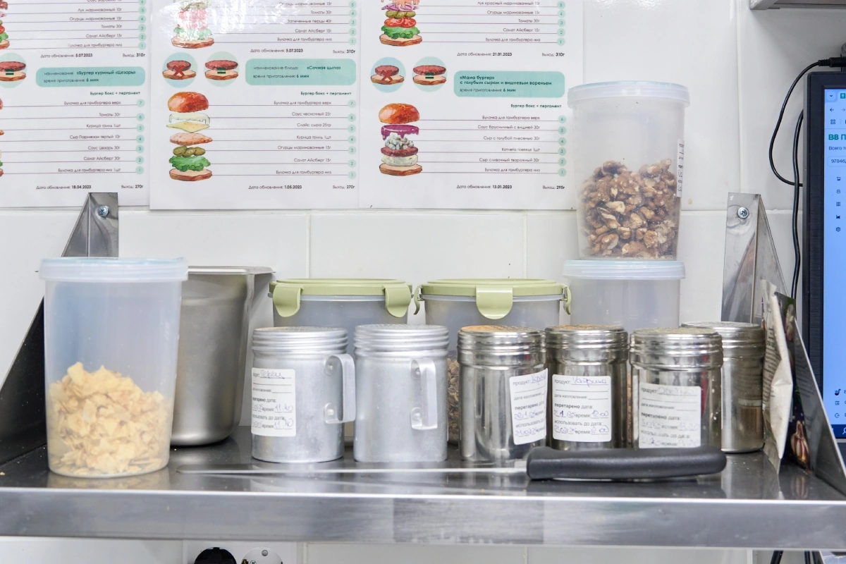 Блюда и полуфабрикаты, которые необходимо доготовить, обязательно промаркированы — за этим и за соблюдением сроков годности следит повар. Над рабочей зоной висят технологические карты для еды «из-под ножа» — блюд, которые готовят тут же, как, например наши сочные бургеры.