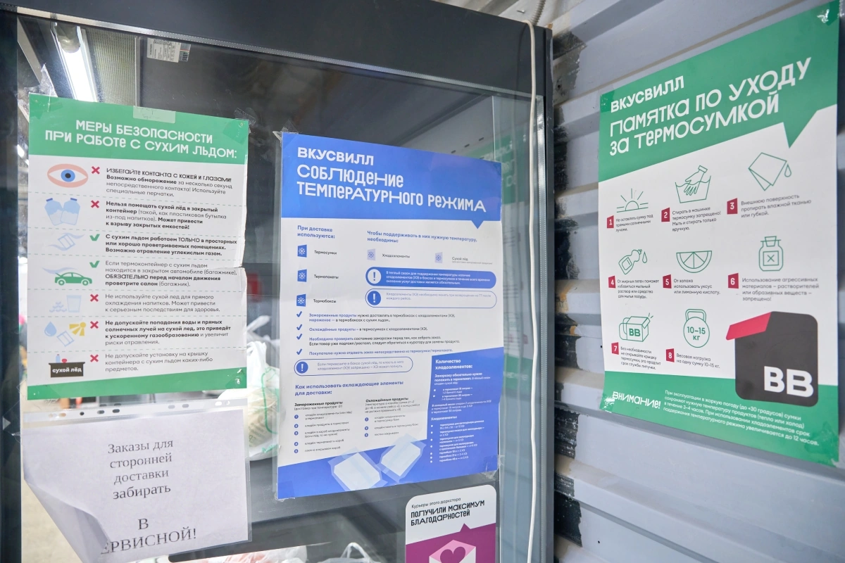 «Получается, что один заказ можем забрать из разного холодильного или теплового оборудования. Мороженое или вареники сборщик упаковывает в отдельный пакет и кладёт в морозилку, а колбасу или молоко ставит в ячейку для охлаждённых продуктов — каждый пакет ждёт в соответствующем температурном режиме, — рассказывает Денис. — И пока везём заказ к вам домой, в офис и на дачу, тоже стараемся сделать всё возможное, чтобы десерты доехали целыми, пельмени — замороженными, а суп — горячим.