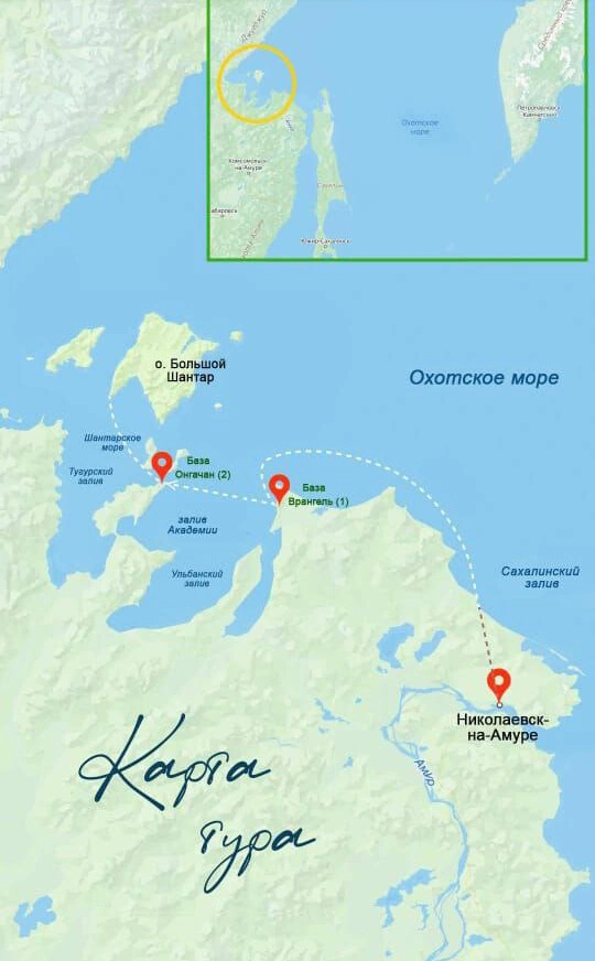 Большой Шантар — тысячи километров. Из Хабаровска до него полтора часа на самолёте. Москва — Хабаровск — семь с половиной часов. Один день на адаптацию, на второй день взяли самолёт Хабаровск — Николаевск-на-Амуре (это прямо на берегу моря). 3 часа на машине до катамарана, и на нём 6 часов до нашего первого кемпа. Потом на второй, потом на третий. На пути мы встретили касаток и двенадцатитонного кита.