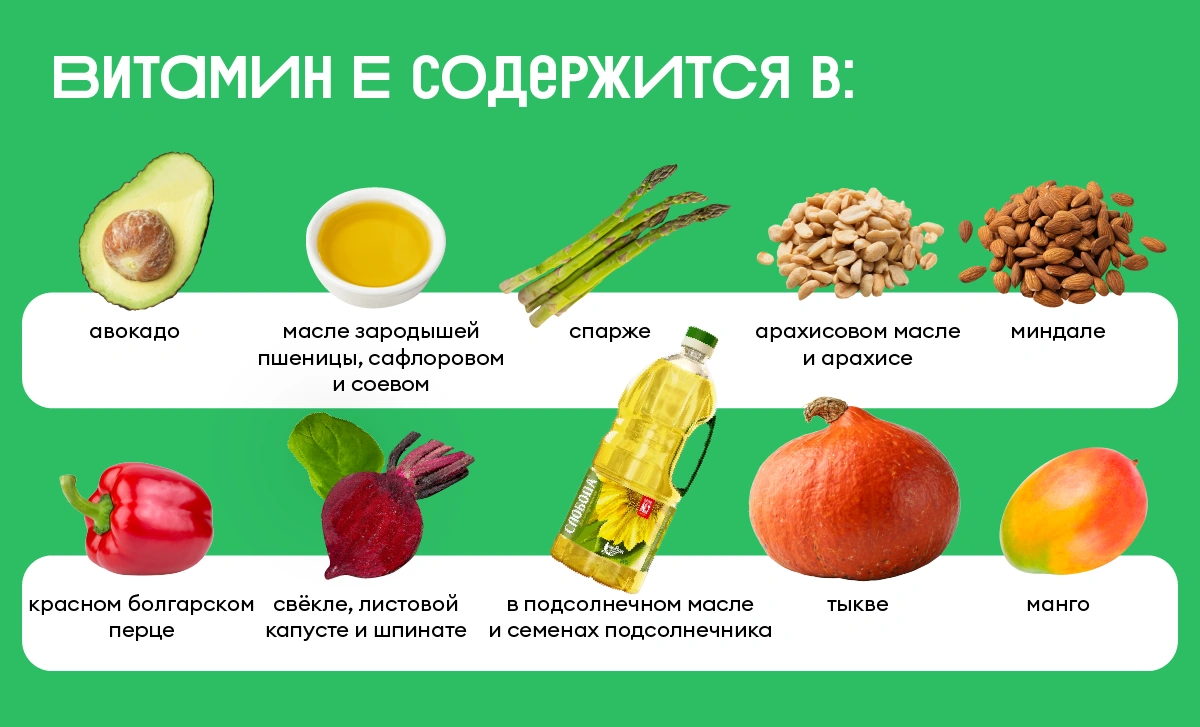 Витамин Е содержится во фруктах и овощах, семенах и орехах, растительных маслах, а конкретно в: