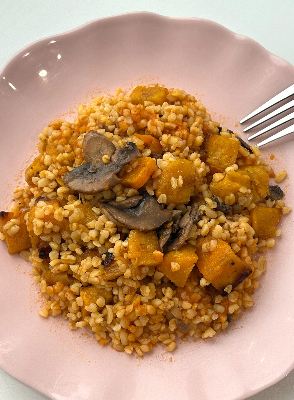 Блюдо с более «осенним» настроением найти будет сложно. Уже с первого взгляда оно покорило меня своими яркими красками: запечённая тыква, золотистые зёрнышки булгура и подрумяненные шампиньоны в овощном соусе — выглядит ну очень аппетитно.