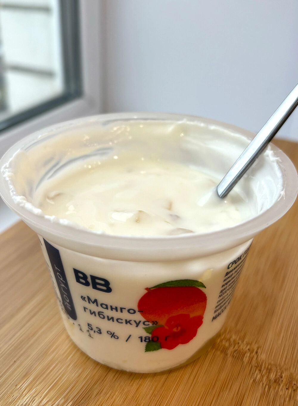 Новинка состоит из двух слоев: густого натурального йогурта и фруктового наполнителя. Ноты гибискуса здесь едва уловимы, а на передний план выходят сочные и крупные кусочки манго.