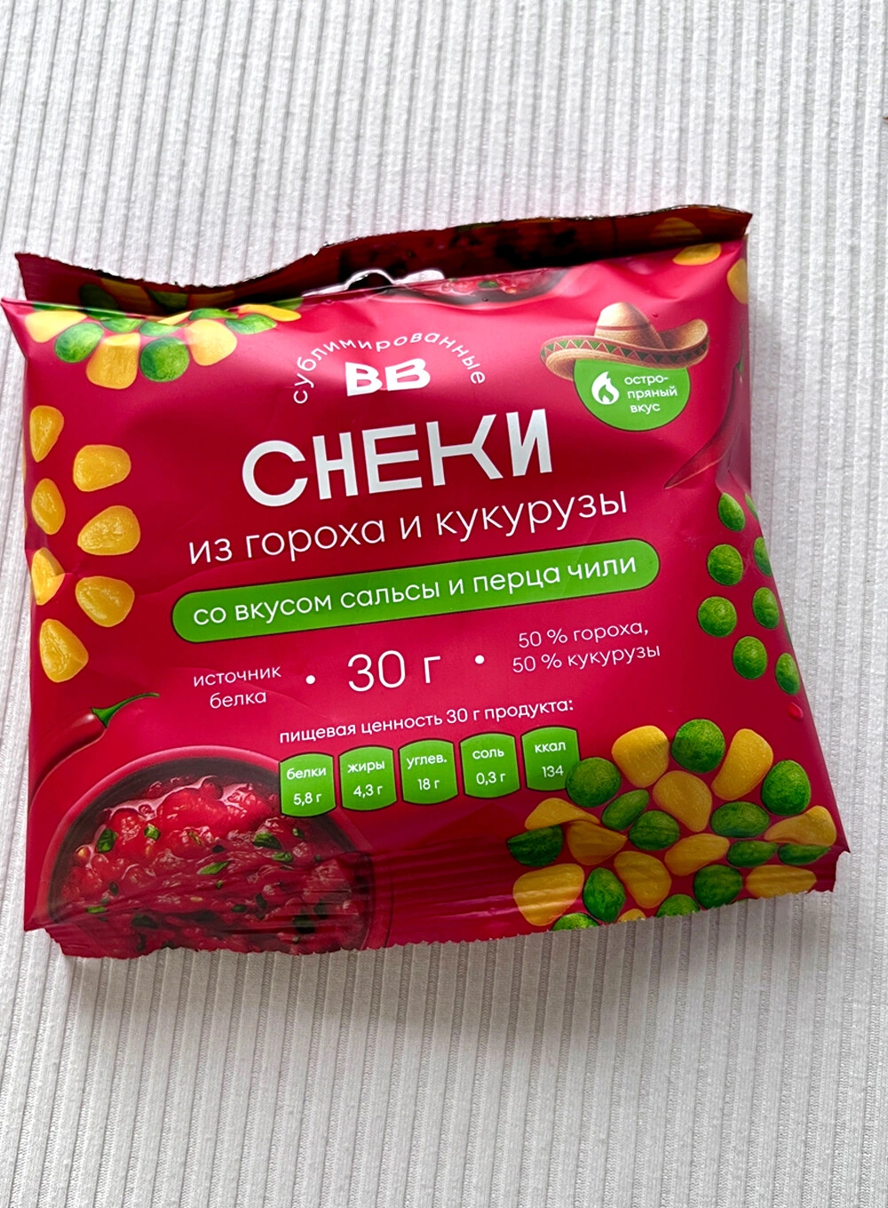 Снеки из кукурузы и гороха со вкусом сальсы и перца чили
