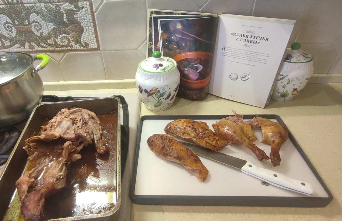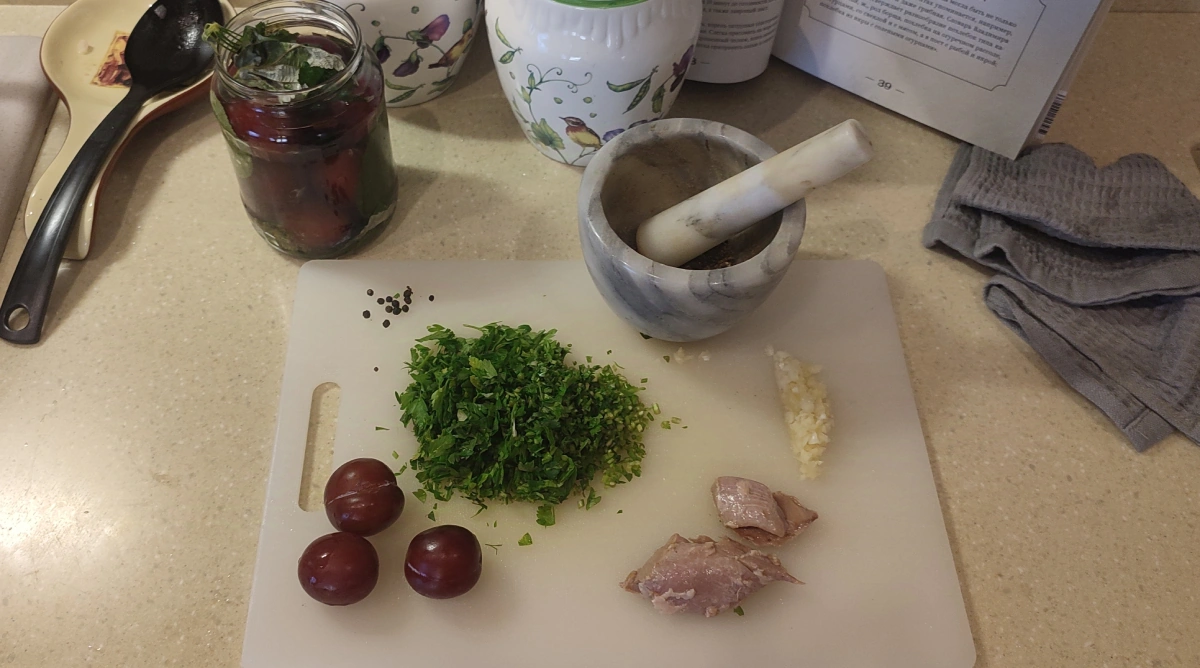 Сливы, засоленные примерно за неделю, тоже отправились в калью вместе с нарезанной петрушкой, чесноком, огуречным рассолом и утиным мясом, обобранным с костей. И если вы внимательно рассмотрели фото, то могли заметить два кусочка мяса на разделочной доске — это и есть те самые «архиерейские».