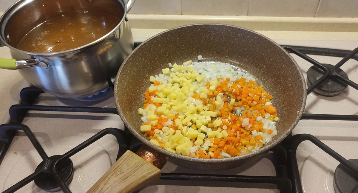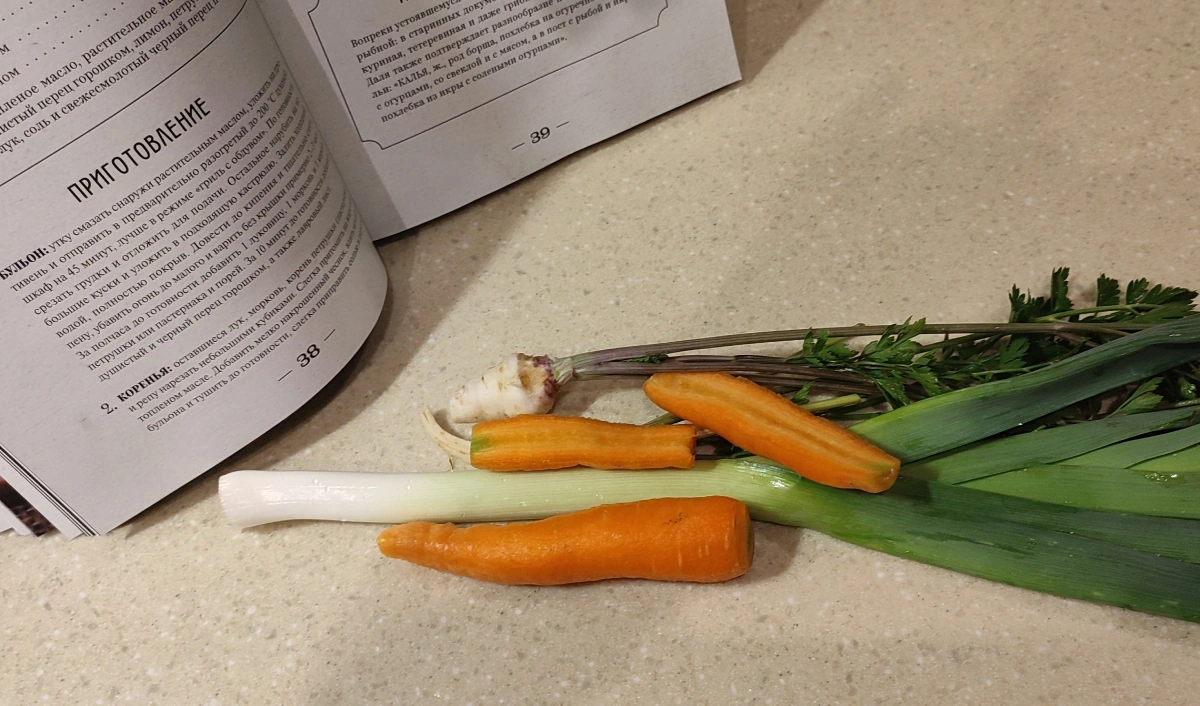 А пока костлявая утиная сущность булькала в кастрюле в компании с пореем, петрушкой и морковкой, на сковороду отправились нарезанные кубиками репчатый лук и коренья: опять же морковь, петрушка и репа.