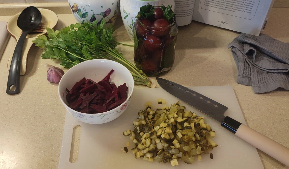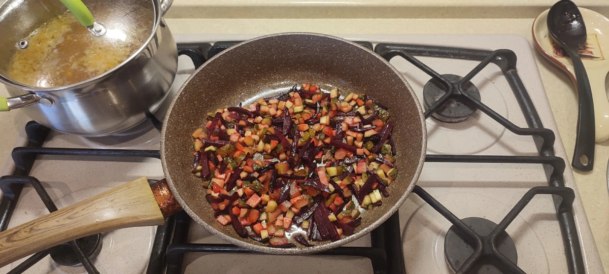 Вторым рейсом на сковороду пошли солёные огурцы кубиками и свёкла соломкой. По мне, если суп не борщ, то свёкла в нём лишняя… Что ж, свои ошибки нужно признавать.