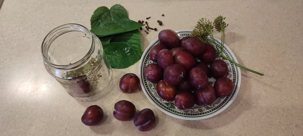 На 1 кг крепких некрупных слив возьмите 1 ст. л. семян аниса или фенхеля, 1 ч. л. чёрного перца горошком, 1 корень хрена (с безымянный палец), 1 лист хрена, по 2–3 листика вишни и смородины, 2–3 зонтика укропа. Рассол на 1 л воды: 2 ст. л. соли (без горки), 1 ст. л. сахара (без горки).