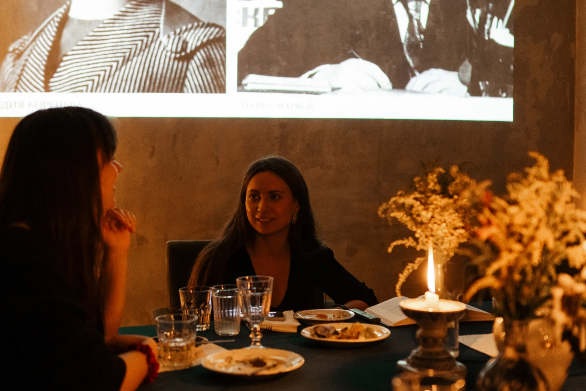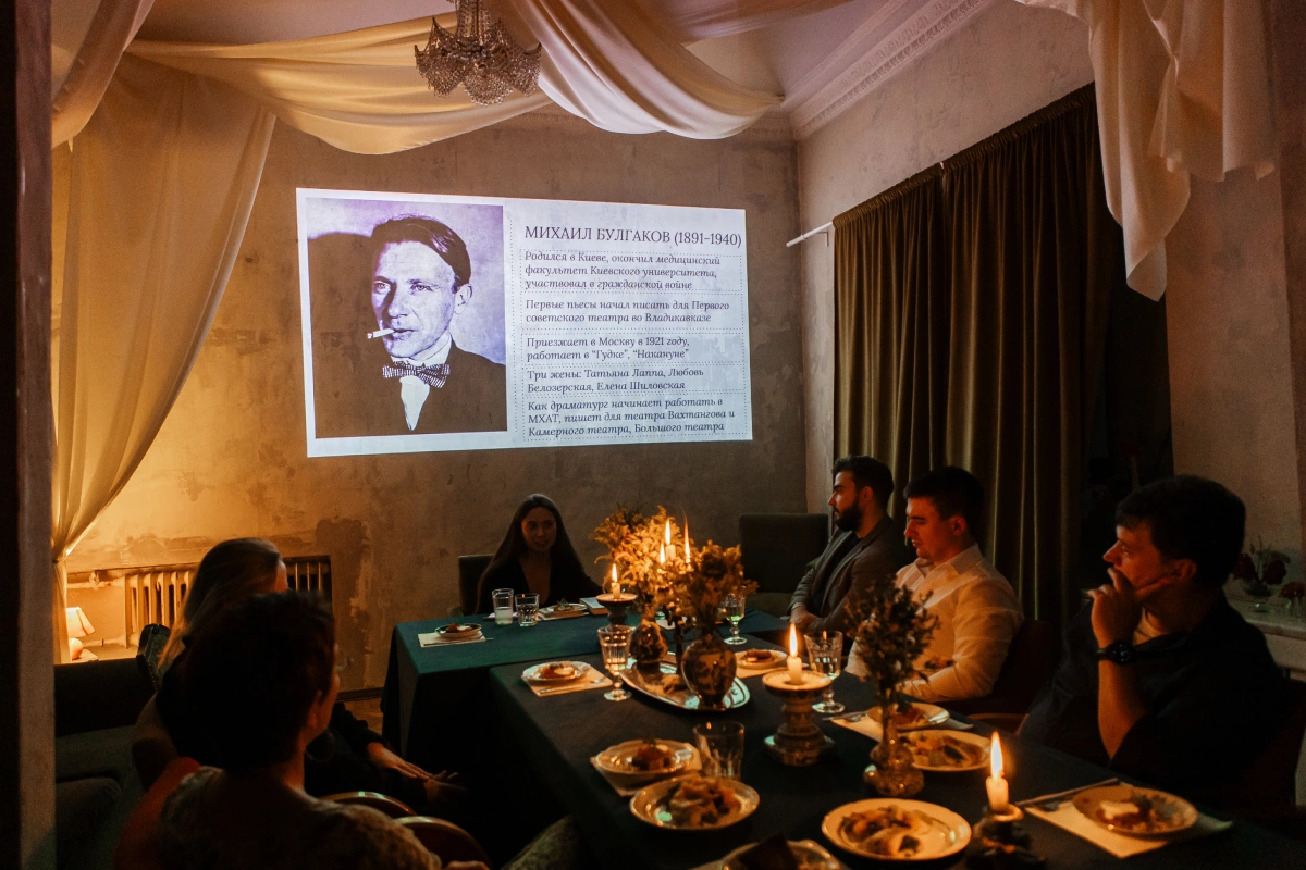 А чтобы атмосфера сразу располагала к свободному общению, всё происходит за ужином — мы разговариваем и едим тематические блюда: характерные для эпохи, упомянутые в произведениях или любимые авторами.