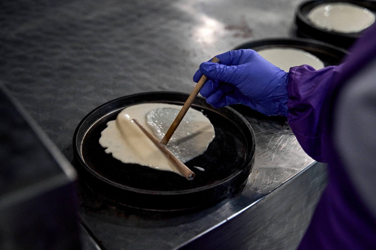 Шоколадные блины делают каждый день и только утром — с них и началась наша экскурсия. Замес теста происходит стандартно и знаком каждому блиноделу: сначала муку просеивают, затем в неё добавляют сахар и соль. В миксере величиной с человека среднего роста сухие ингредиенты смешивают с меланжем, подсолнечным маслом и молоком. Для шоколадных блинов в тесто добавляют ещё какао-порошок. Затем начинается самое увлекательное: выпекание.