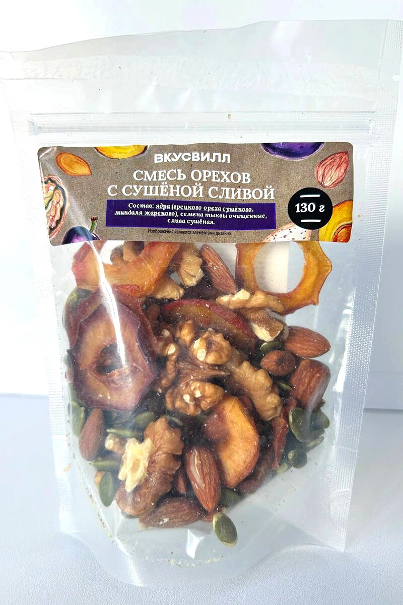 Смесь приятно удивила: сливы мягкие, не пересушенные, с ярким, чуть кисловатым вкусом, который отлично сочетается с хрустом миндаля, насыщенностью грецкого ореха и тыквенными семечками. Сладость сливы и сытность орехов — отличный перекус: вкусно и надолго избавляет от чувства голода. Компактная упаковка с зип-замком — большой плюс: удобно бросить в сумку и не переживать, что содержимое рассыпется.