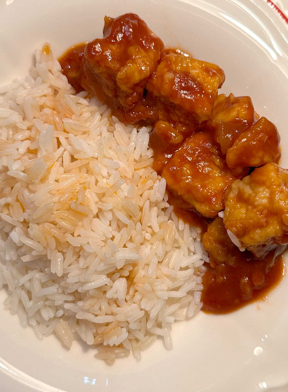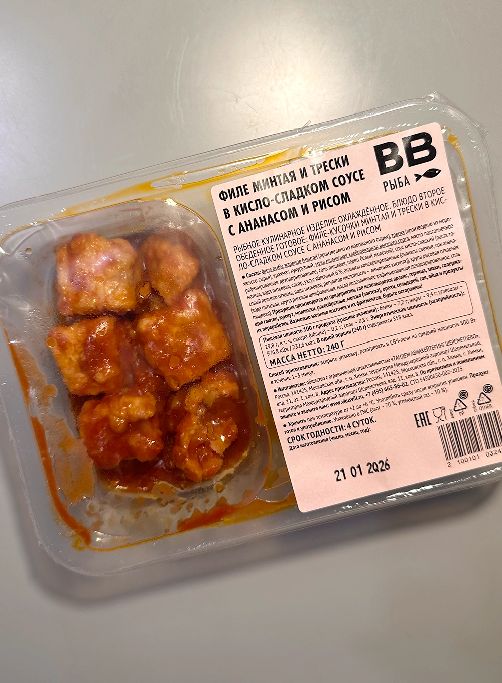 Первое, что меня зацепило, — это соус. Кисло-сладкий, с тропическими акцентами, которые интересно оттеняют рыбное филе. Ананас привносит сладость, а она делает вкус ещё более ярким и необычным.
