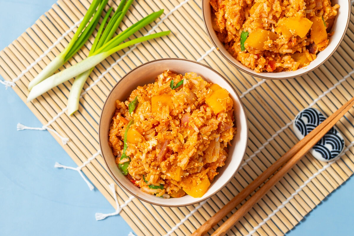 Ещё одно блюдо, популярное на юге Китая. Регулировать остроту риса можно количеством соуса шрирача: добавьте больше или меньше в зависимости от ваших вкусовых предпочтений. По желанию добавьте в блюдо жареные креветки или курицу.