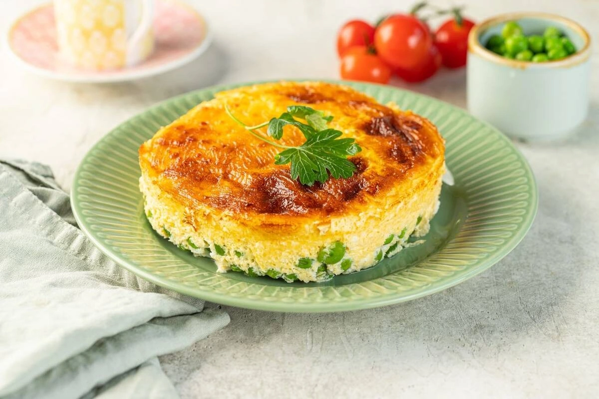 Высокий пышный омлет делается просто и быстро в духовке. К нему хорошо подходит нежный зелёный горошек, но можно использовать также и другие овощи либо кусочки сыра или ветчины.