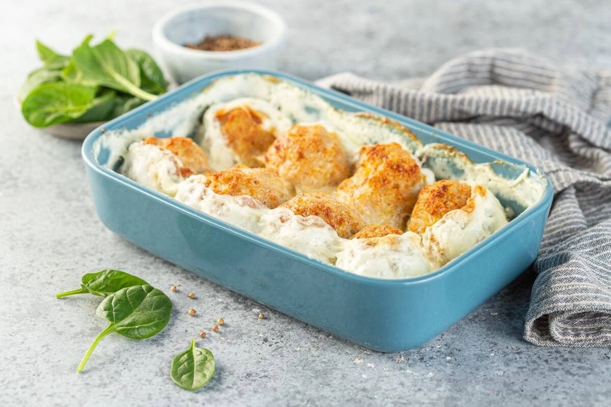 - Сделайте из фарша шарики, выложите в форму для запекания. Запекайте в духовом шкафу 20 минут при 200 °C. Затем влейте в форму сливки и запекайте ещё 10-15 минут.