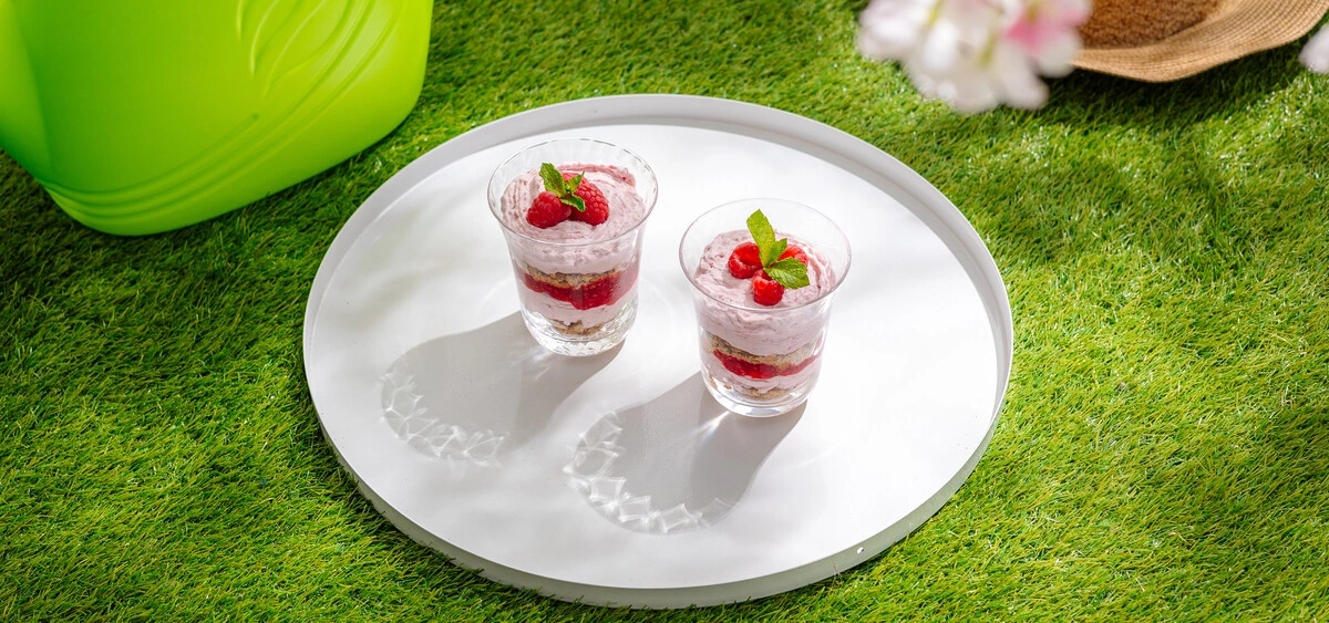 - Соберите трайфлы в следующей последовательности: печенье, крем, малиновая начинка, печенье, крем. Украсьте свежими ягодами.