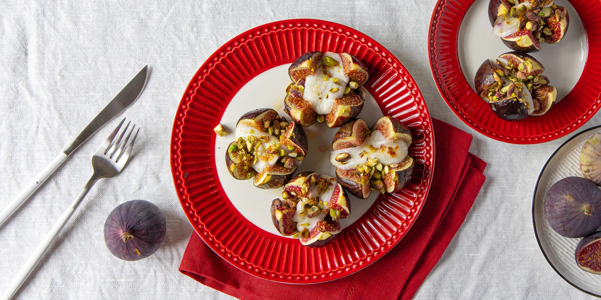 - У инжира срежьте плодоножки, каждый плод надрежьте крестом, а затем примните основание большим пальцем так, чтобы он раскрылся, как цветок.