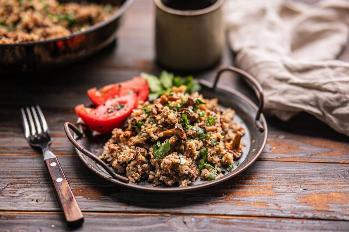 В походных условиях можно есть и куда более изысканные блюда, чем шулюм. Например, гречку с грибами — в том числе и лисичками. Грибы можно собрать в лесу, а гречку привезти с собой и запарить в термосе.