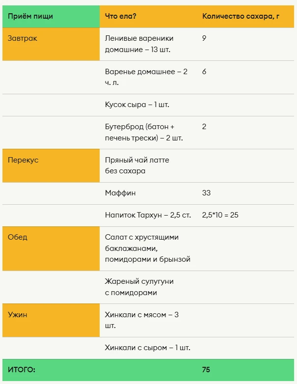 Если сложить эти цифры и разделить на 5, получается, что в среднем Анна съедает примерно 73 г сахара, что ~ в 2 раза больше безопасной нормы.