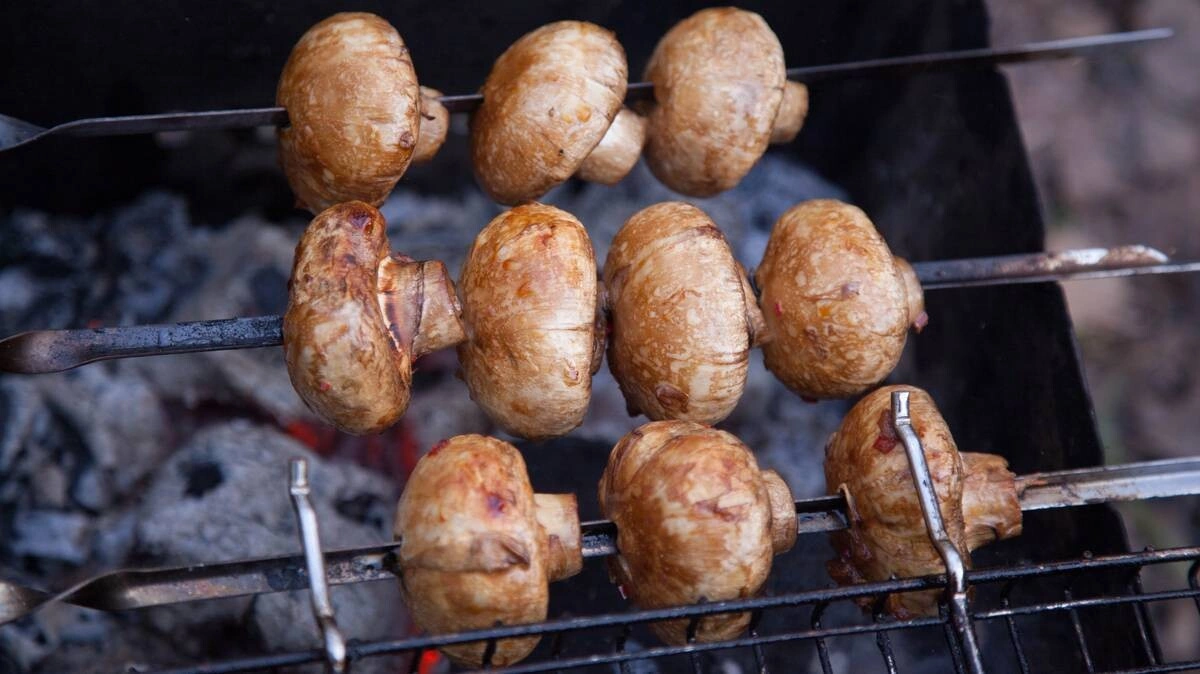 4. Насадите шампиньоны на шампуры и жарьте над горячими углями до золотистого цвета.