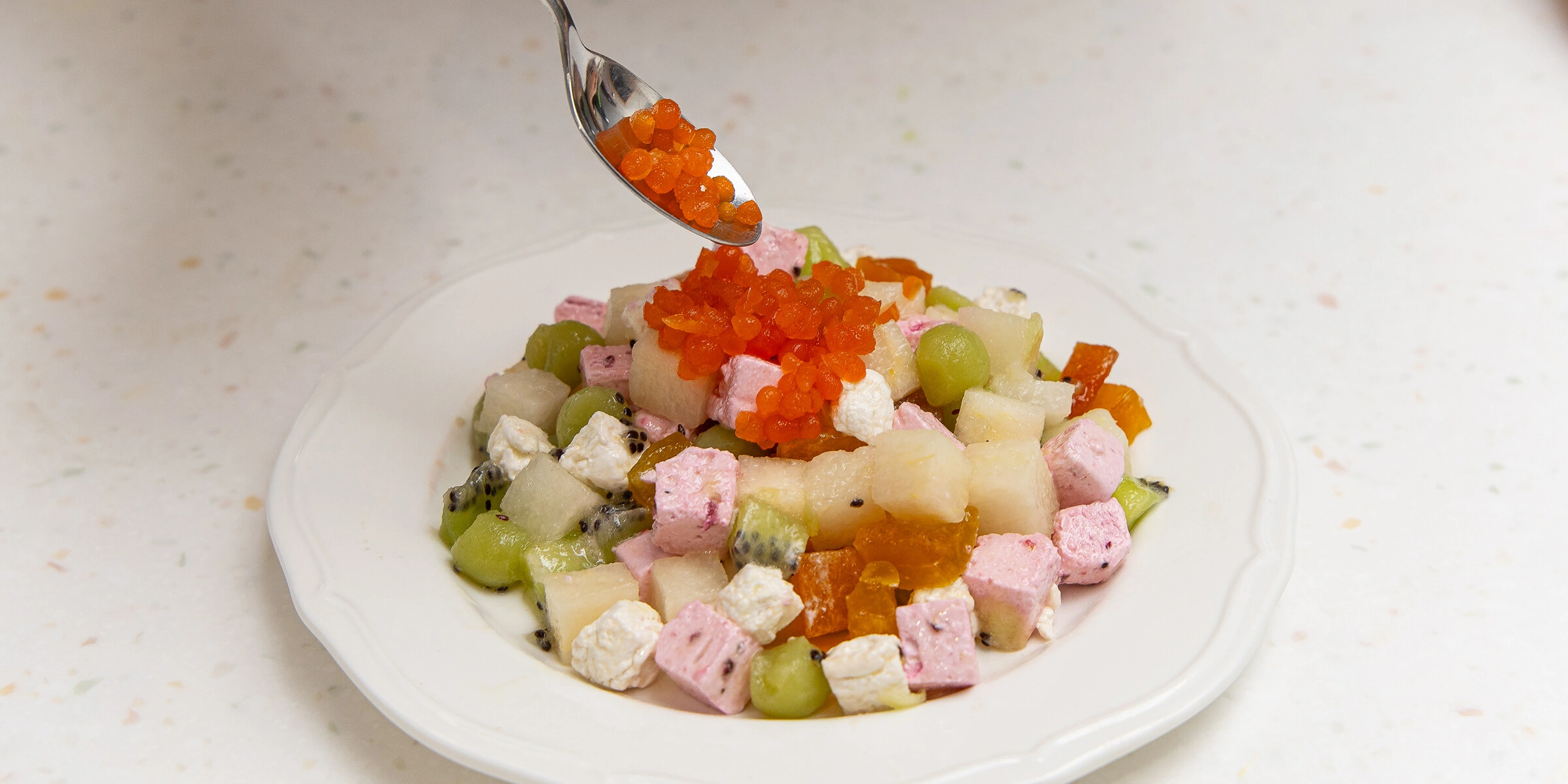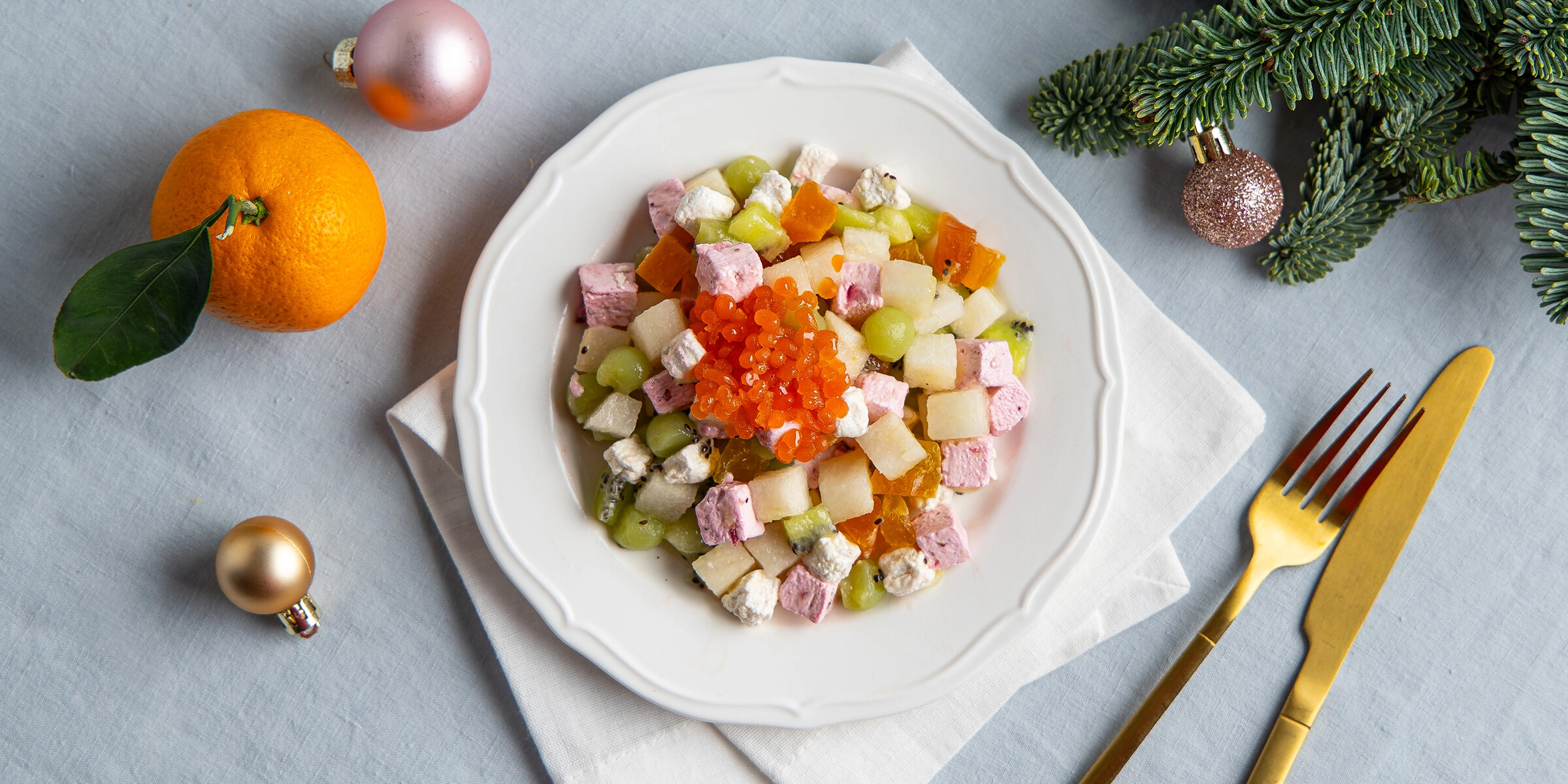 Важно: апельсиновая «икра» в этом рецепте — декоративный элемент. Она делает подачу эффектной, но не влияет на вкус сладкого оливье, поэтому её можно смело пропустить, если хочется упростить рецепт.