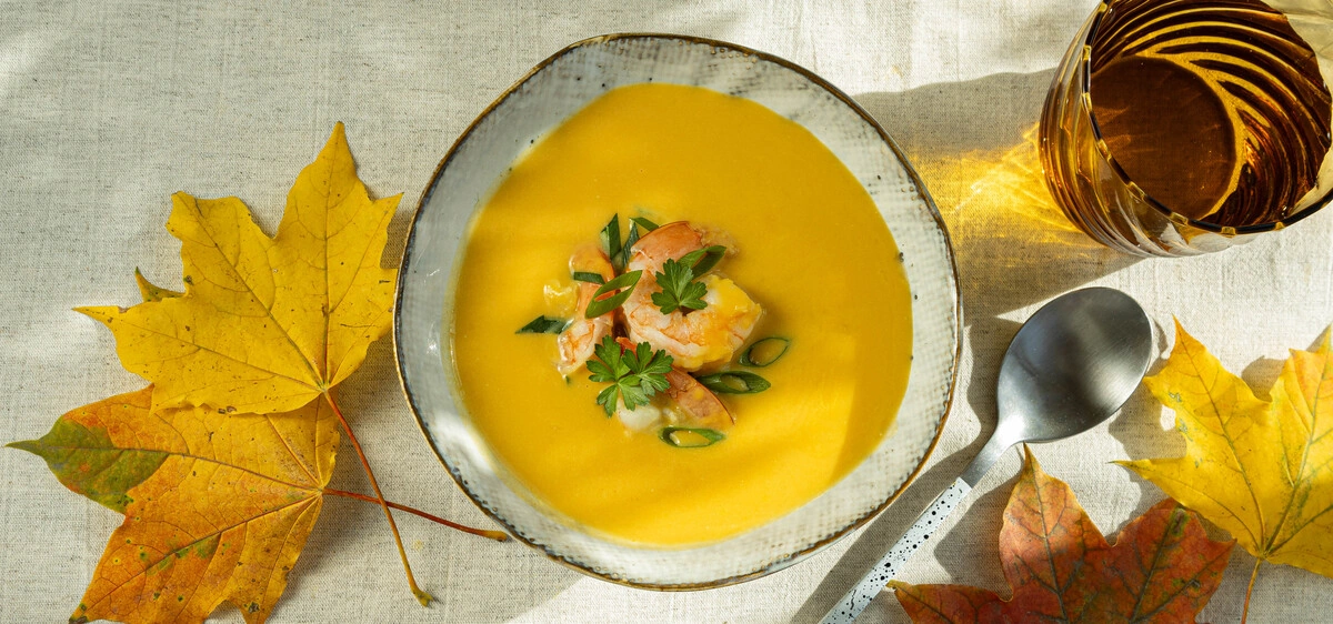 Тыквенных супов много не бывает! Приготовили ещё один на азиатский манер: на кокосовом молоке, с креветками и карри. Получился аппетитный крем-суп с экзотическими нотками — нежный, согревающий и по-настоящему осенний.