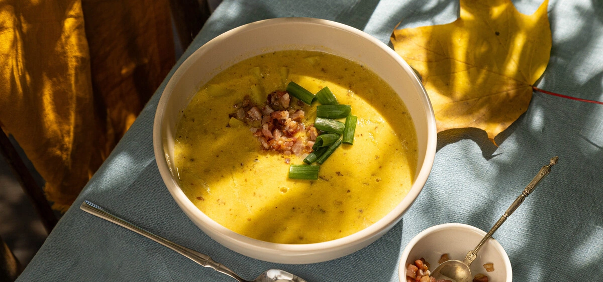 Знакомьтесь — чаудер, суп с богатой историей. Ему уже больше 300 лет, а он до сих пор остаётся таким же популярным! И это неудивительно, ведь само слово «чаудер» переводится как «котёл» — то есть, в него можно отправить всё самое вкусное, что есть под рукой. Классического рецепта не существует: такой суп готовят и с морепродуктами, и с рыбой, и с колбасками. Мы предлагаем вариант чаудера с кукурузой и хрустящим беконом.