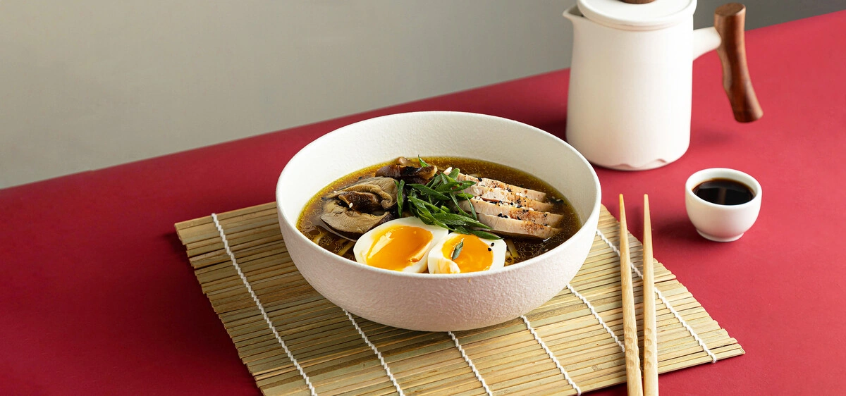 В основе этого японского супа — ароматный бульон из овощей, грибов и специй, который можно приготовить заранее и хранить в холодильнике несколько дней. А перед подачей останется только собрать ваш идеальный рамен: добавить куриную грудку, отварное яйцо, лапшу или даже готовые гёдза. Быстро, сытно и вкусно!