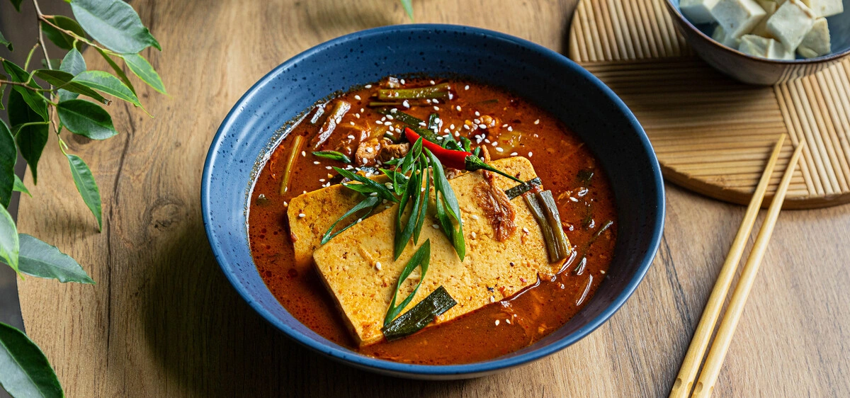 Кимчи чиге — пикантный корейский суп на основе капусты кимчи. Если вы не любите слишком острую еду, советуем уменьшить количество пасты кочудян или подать блюдо с отварным рисом. Он не только сбалансирует вкус, но и сделает суп сытнее.