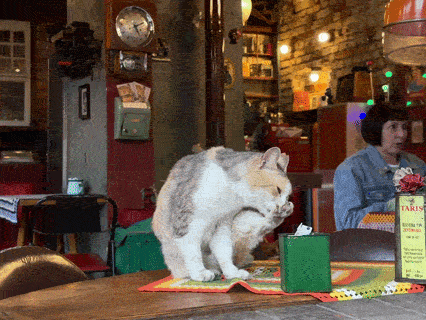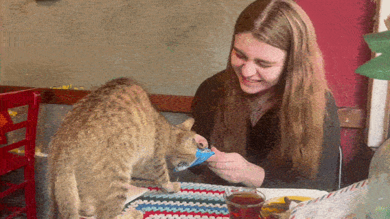 Старинные печи, артефакты прошлого, вещицы с блошиных рынков, невероятная атмосфера и, конечно, коты. Пушистые здесь не просто живут — они полноценные хозяева заведения. Например, могут спокойно пройтись по вашему столу. И это нормально. Вот они, как говорится, слева направо : котик Яичный омлет, кошечка Бздык и 16-летняя красотка, имени которой я не запомнила …